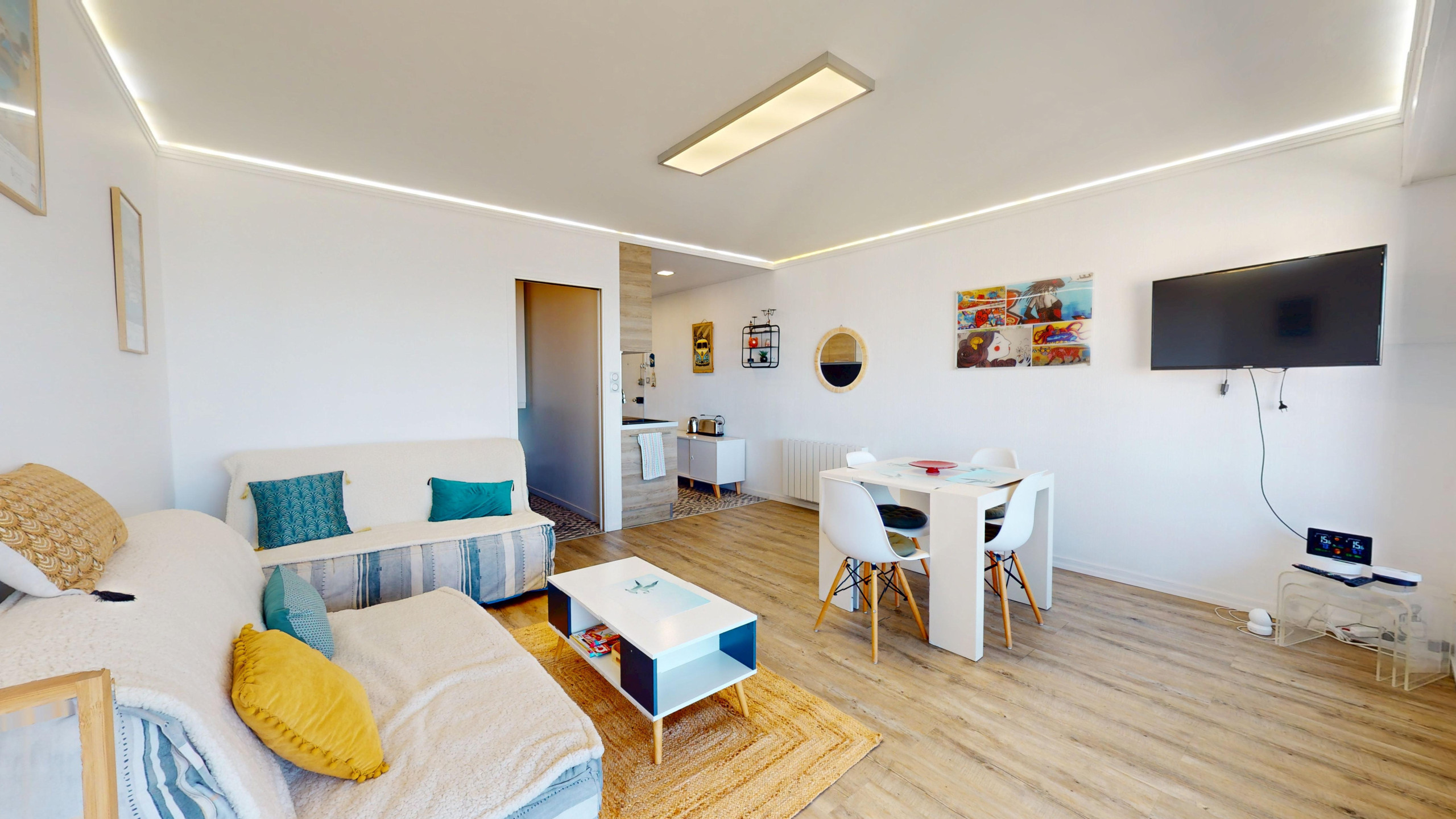 Le logement comprend une chambre confortable avec un lit double 140x190, parfaite pour des nuits reposantes. Dans le séjour, un canapé-lit double 140x190 permet d’accueillir deux couchages supplémentaires. Le petit salon cosy, équipé d’une télévision, invite à la détente après une journée à la plage.
