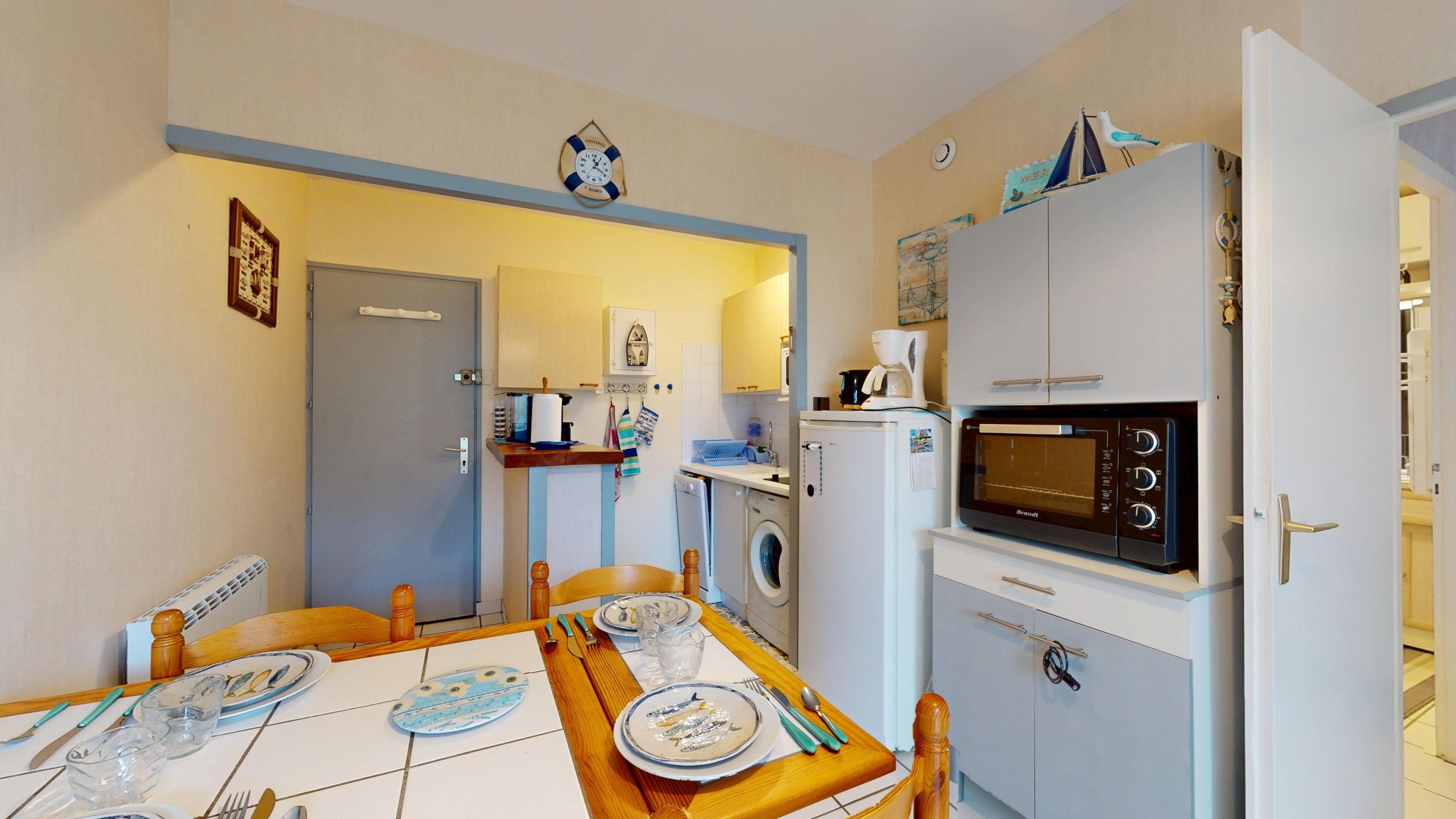 Dès l’entrée, vous découvrez un espace salle à manger accueillant, équipé d’une jolie table pour 4 personnes, idéal pour partager vos repas. Juste derrière, la cuisine ouverte, moderne et entièrement équipée, dispose de plaques vitrocéramiques et de tout le nécessaire pour cuisiner en toute simplicité.