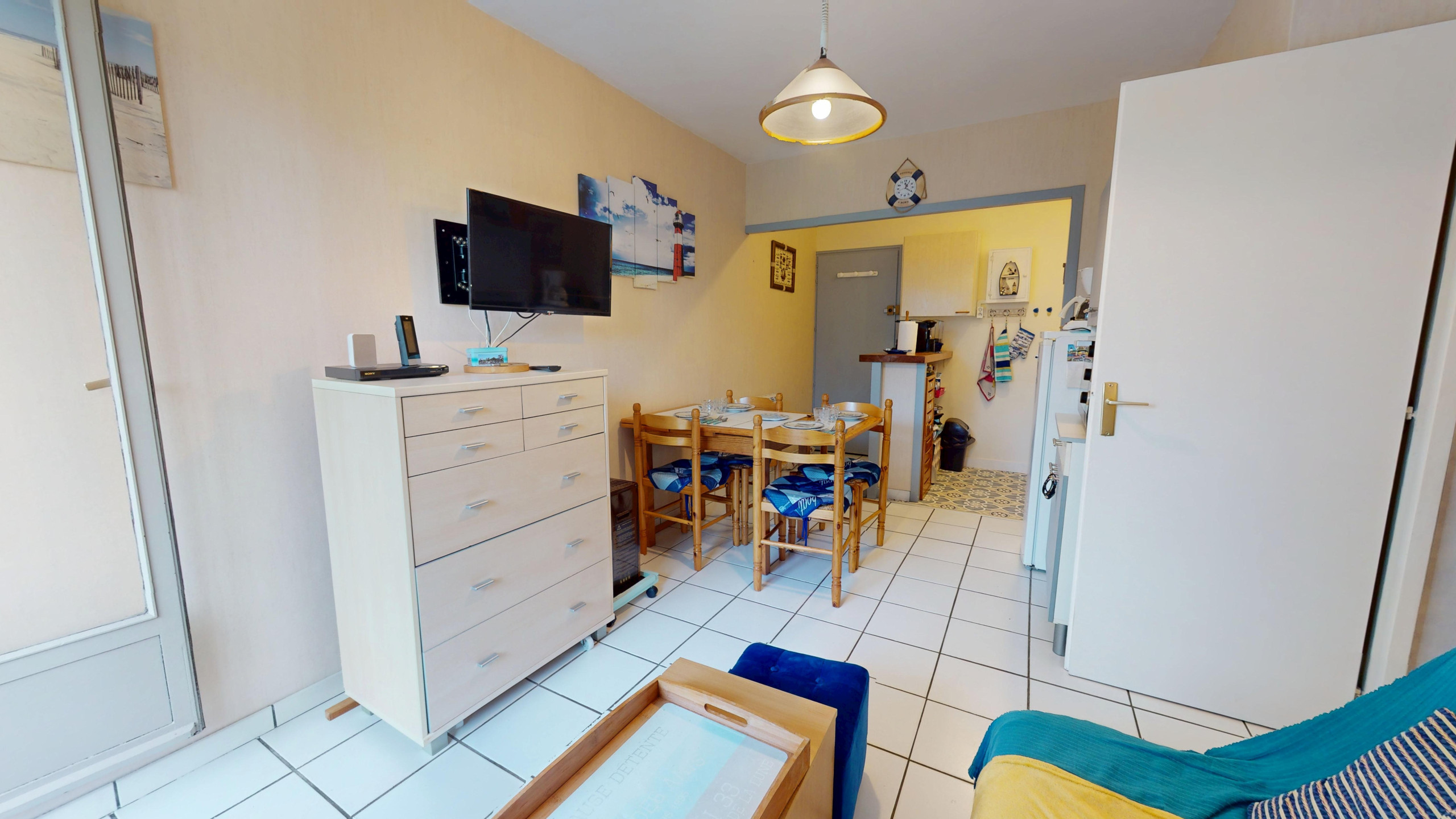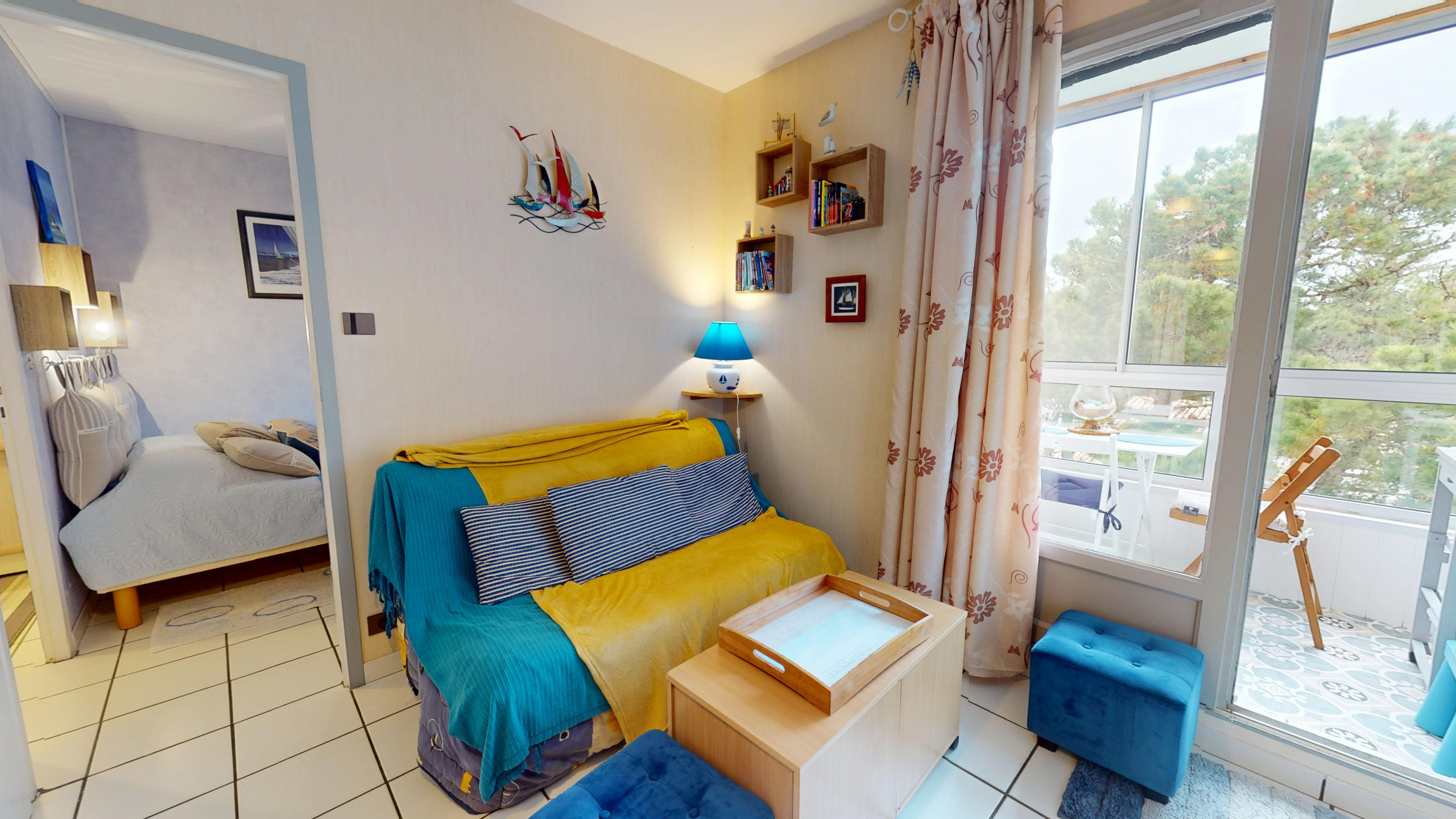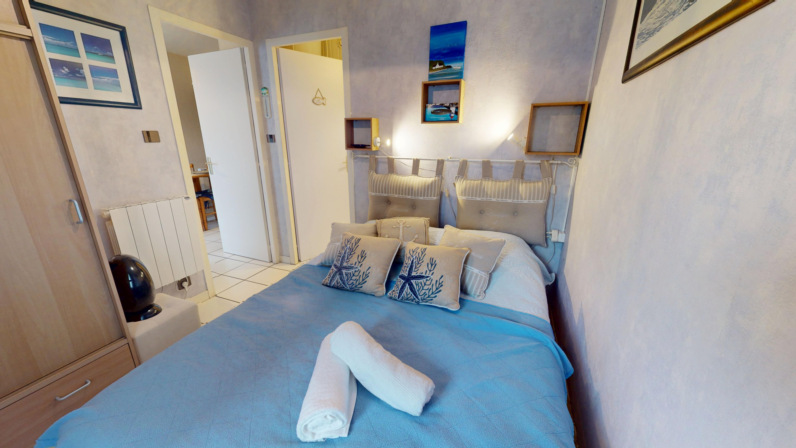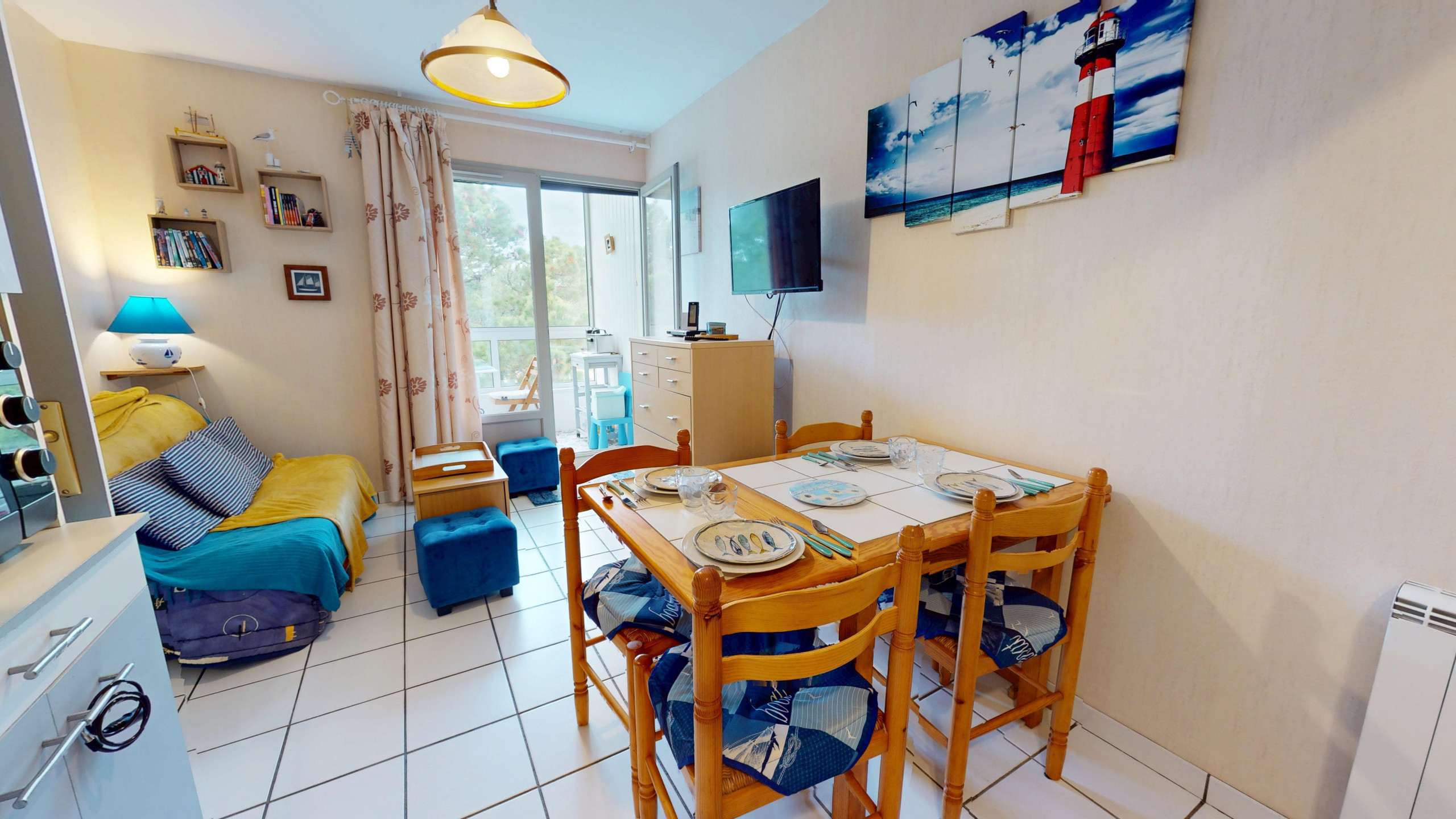 Le logement comprend une chambre confortable avec un lit double 140x190, parfaite pour des nuits reposantes. Dans le séjour, un canapé-lit double 140x190 permet d’accueillir deux couchages supplémentaires. Le petit salon cosy, équipé d’une télévision, invite à la détente après une journée à la plage.