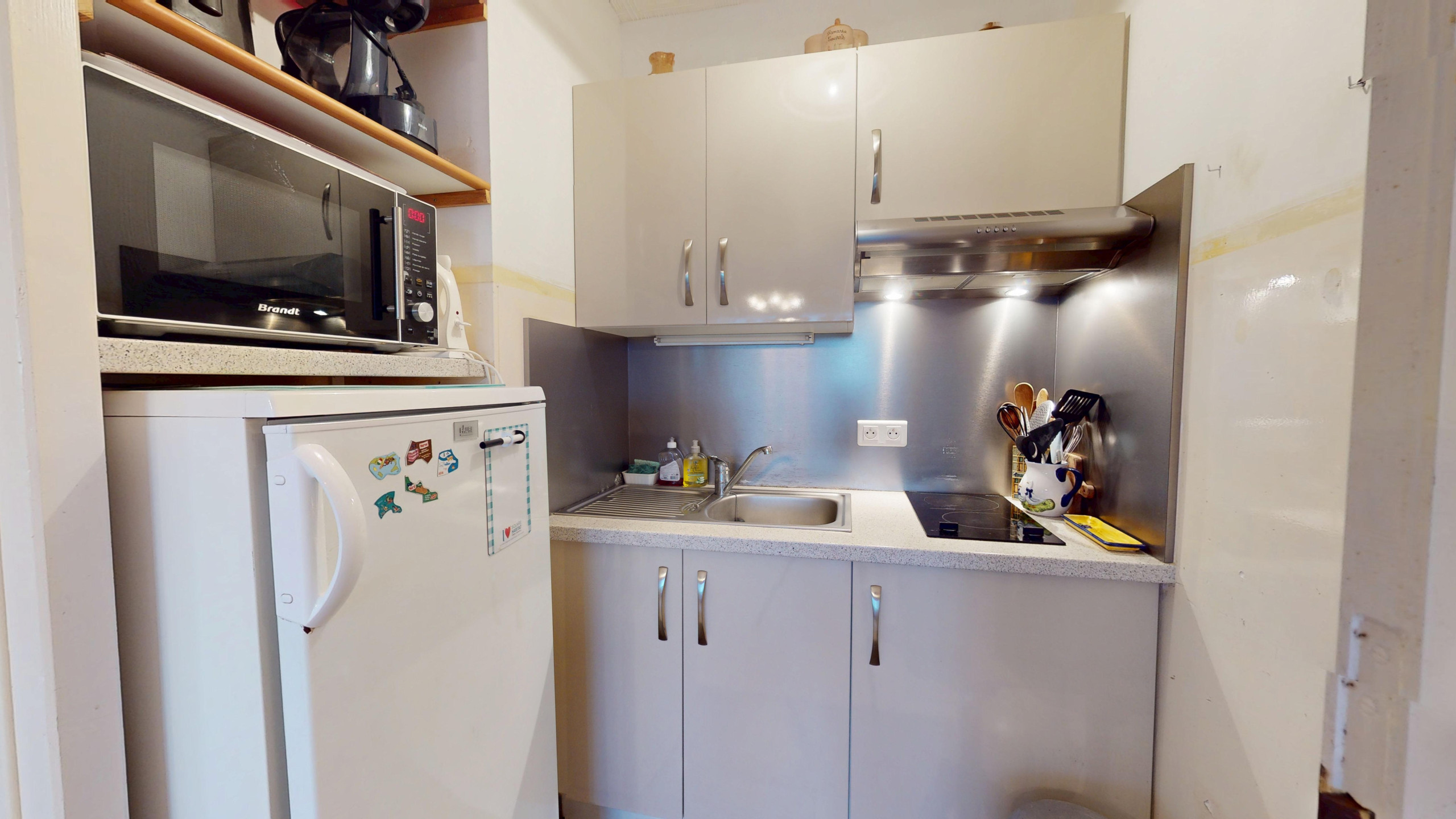 La cuisine ouverte, entièrement équipée, dispose de plaques à induction et de tout le nécessaire pour préparer vos repas facilement.