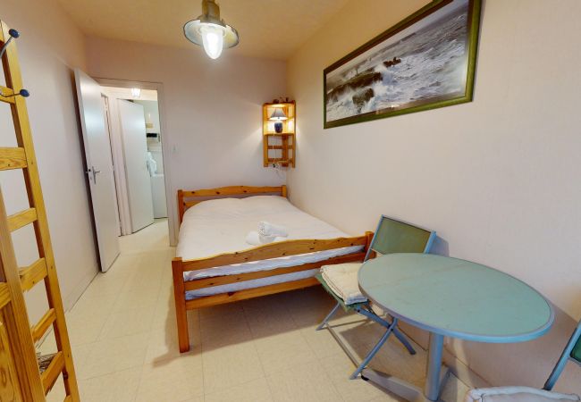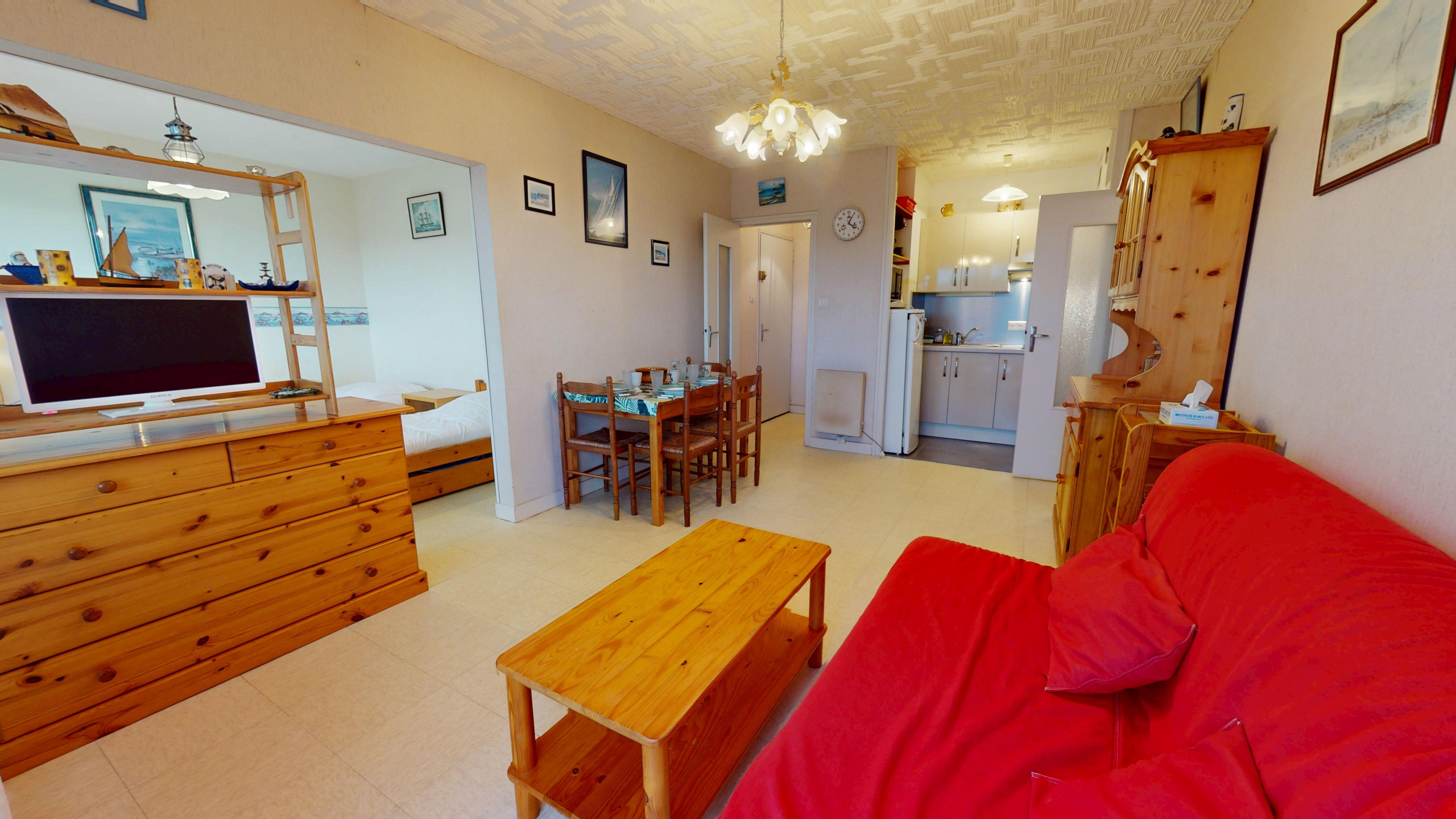 Cet appartement de 47 m², conçu pour accueillir jusqu’à 6 personnes, offre un bel équilibre entre praticité, confort et convivialité. La cuisine ouverte sur le salon, équipée de plaques vitrocéramiques et de tout le nécessaire, vous permettra de préparer facilement vos repas en revenant de la plage. Le salon, très lumineux et accueillant, dispose d’un clic-clac 140x190, idéal pour des moments de détente.