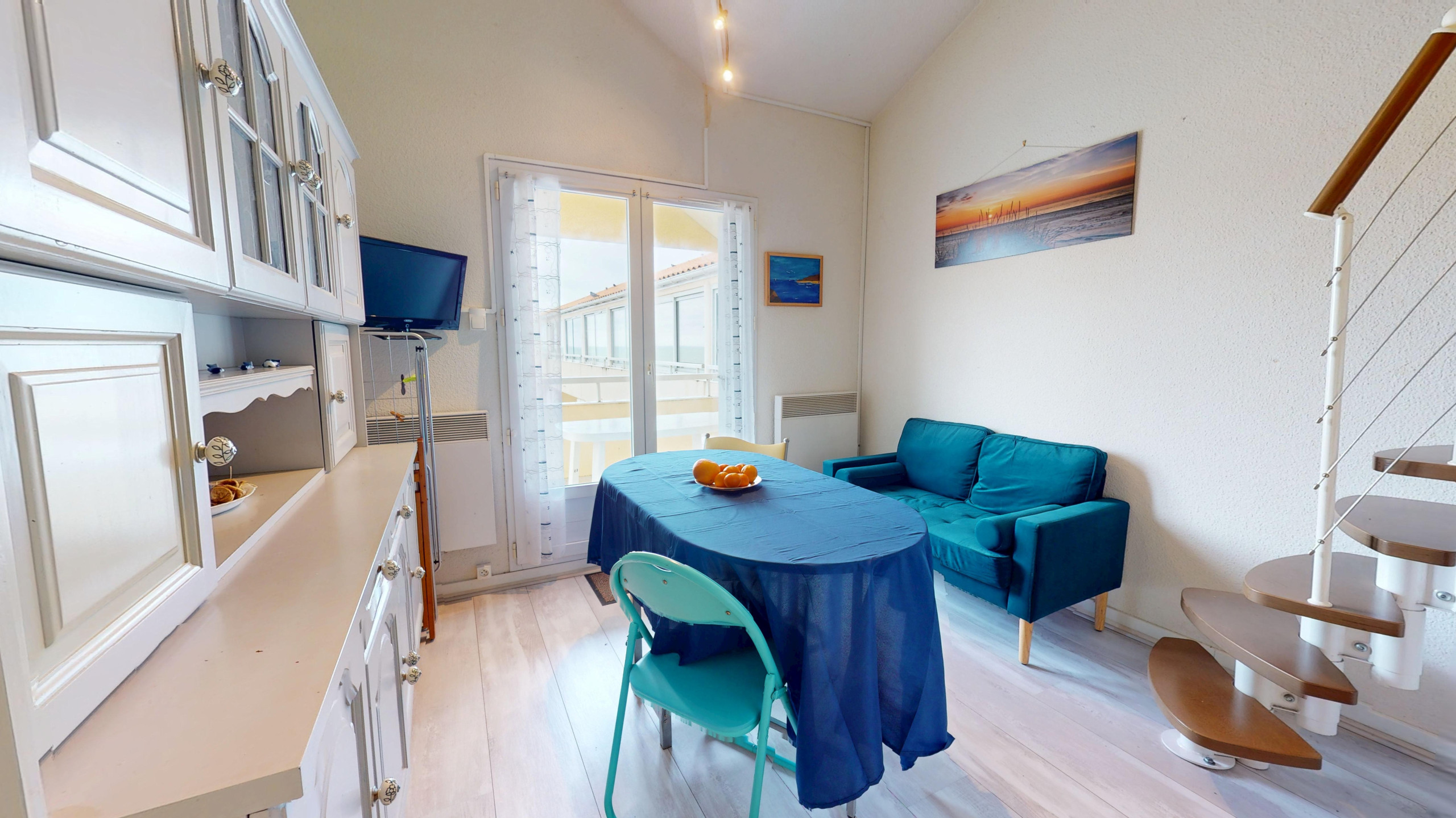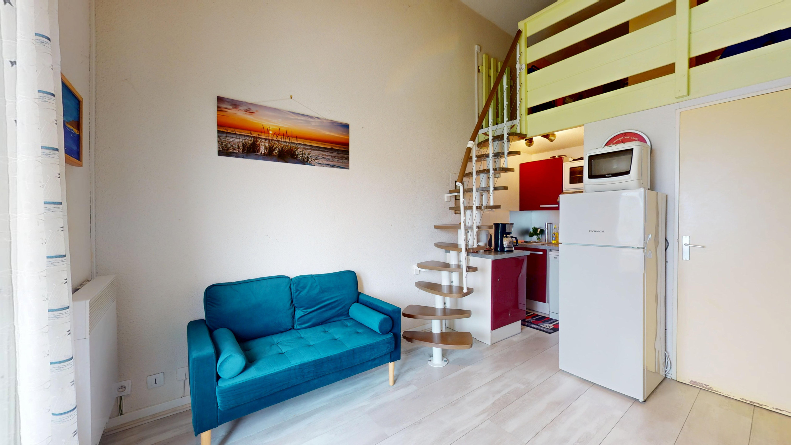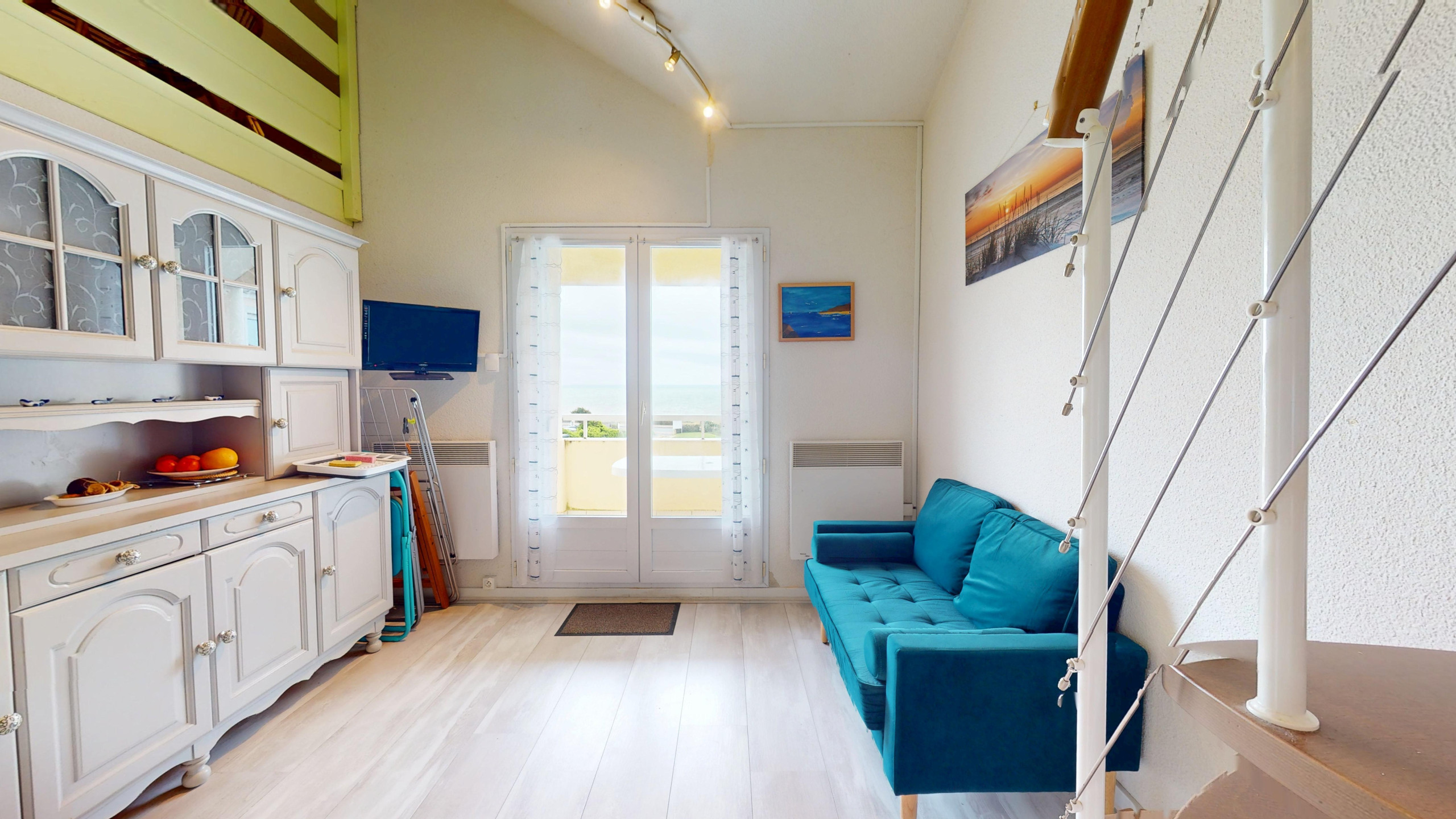 Le Spot de la Corniche propose un intérieur malin et chaleureux. Au premier niveau, vous profiterez d'une chambre indépendante avec lit double (140x190) et d'une salle de bain attenante avec baignoire, ainsi que des WC séparés. La pièce de vie, où l’on aperçoit déjà l'écume des vagues, regroupe un salon cosy avec télévision, une table à manger conviviale et une cuisine ouverte entièrement équipée (plaques à gaz et tout le nécessaire culinaire). À l’étage, une mezzanine spacieuse accueille un second lit double (140x190) ainsi que deux lits simples (90x190), offrant une grande flexibilité de couchage.
