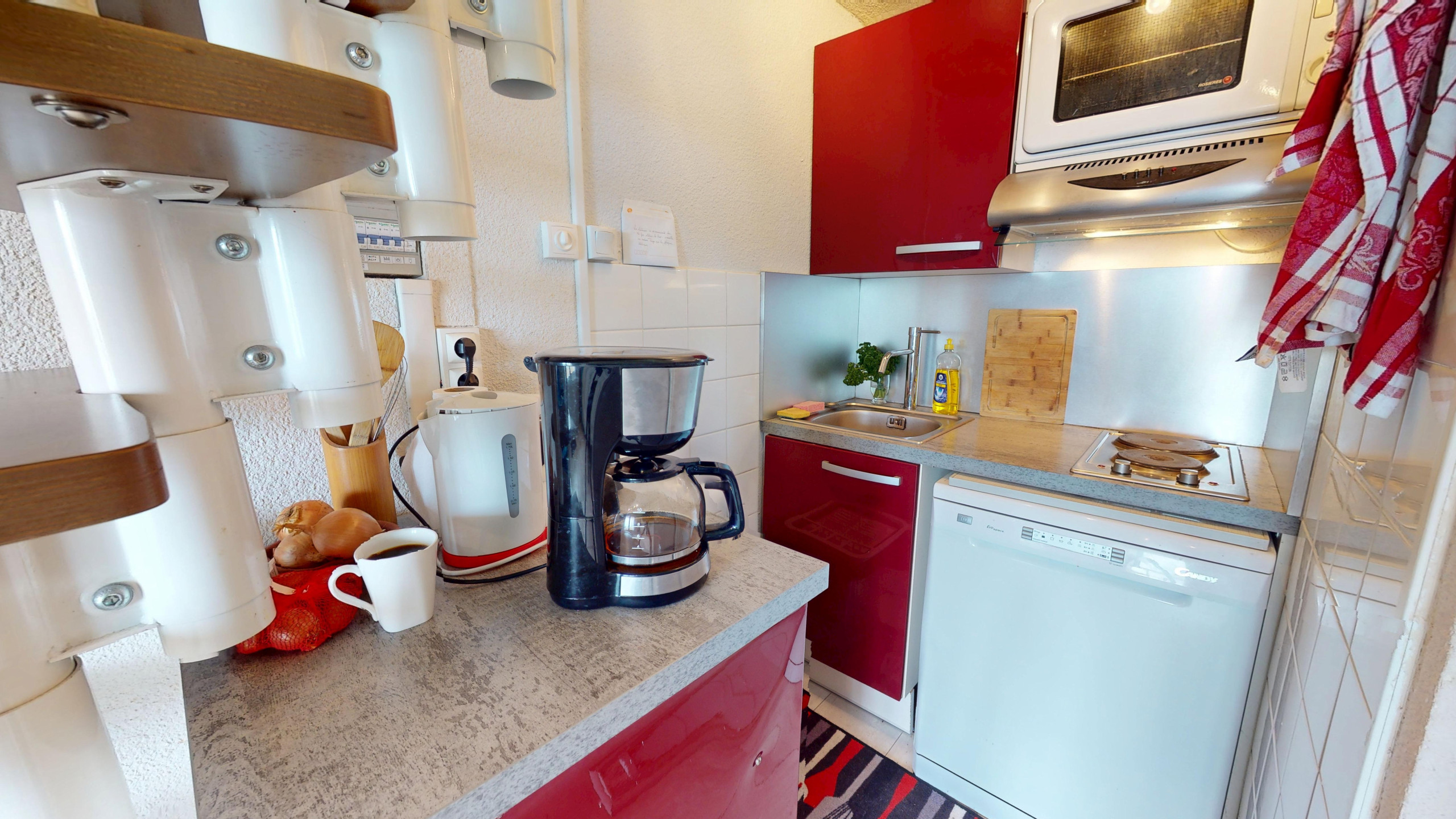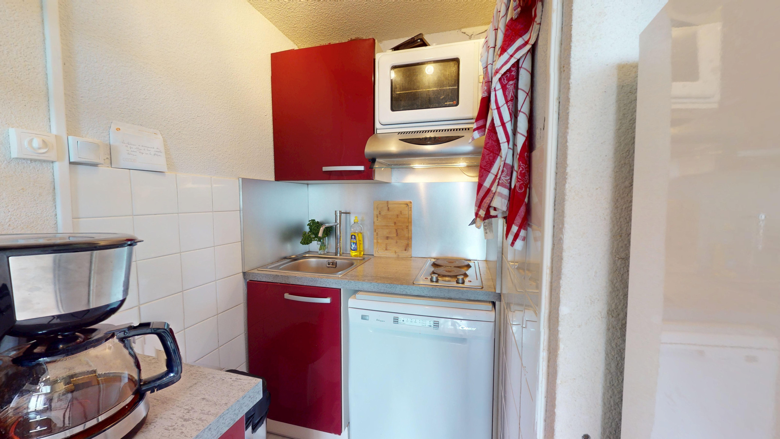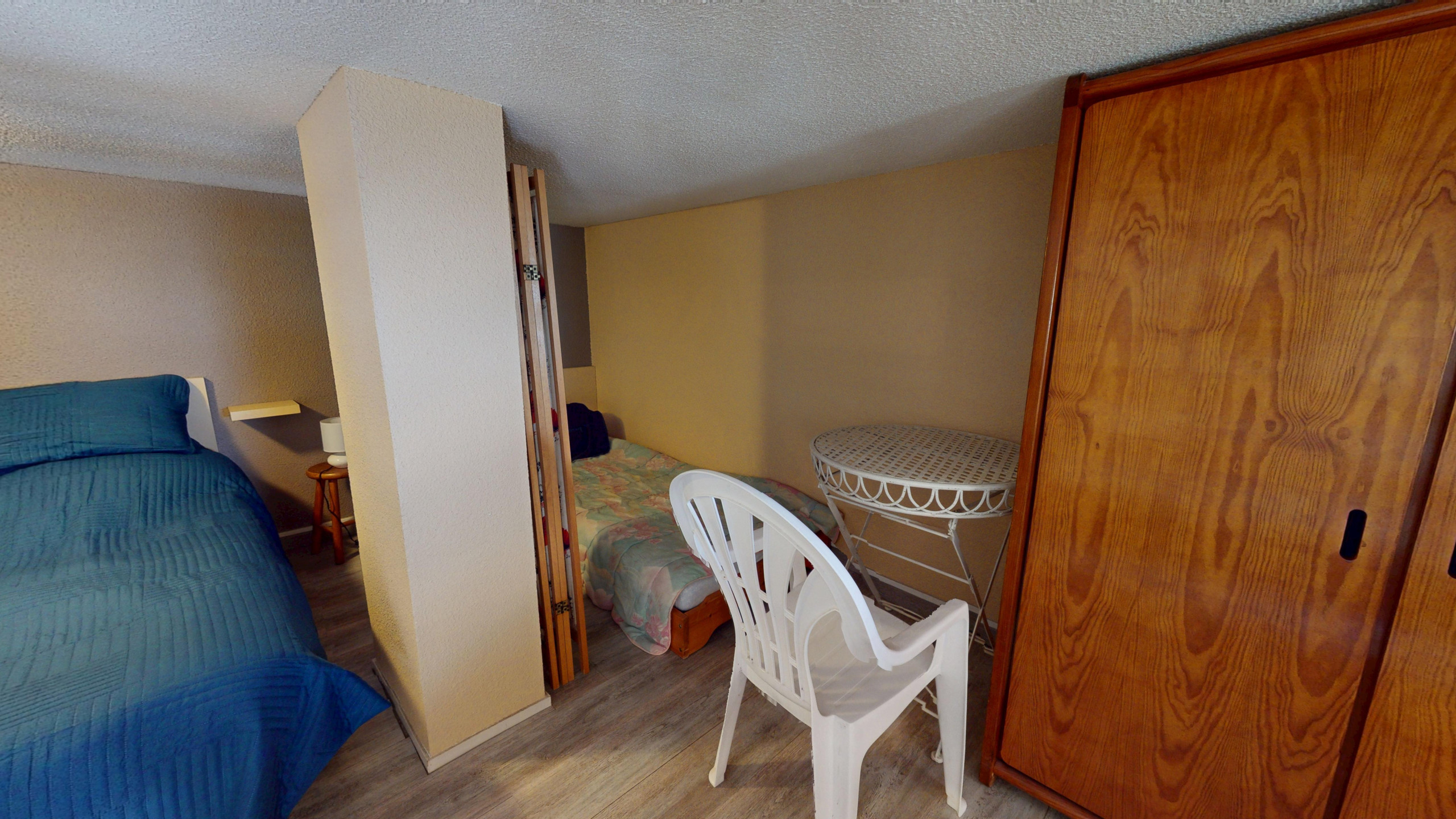 Dès l'entrée, l'espace est judicieusement utilisé avec un coin nuit indépendant niché dans le couloir : derrière de jolis rideaux, vous découvrirez deux lits superposés (90x190), parfaits pour les enfants ou les amis. Le logement dispose ensuite d'une salle d'eau moderne avec douche et de WC séparés. La pièce de vie, lumineuse et conviviale, regroupe un salon avec télévision et un canapé-lit double (140x190) de qualité, un espace salle à manger pour 4 personnes, ainsi qu'une cuisine ouverte moderne entièrement équipée (plaques à induction et tout le nécessaire culinaire).