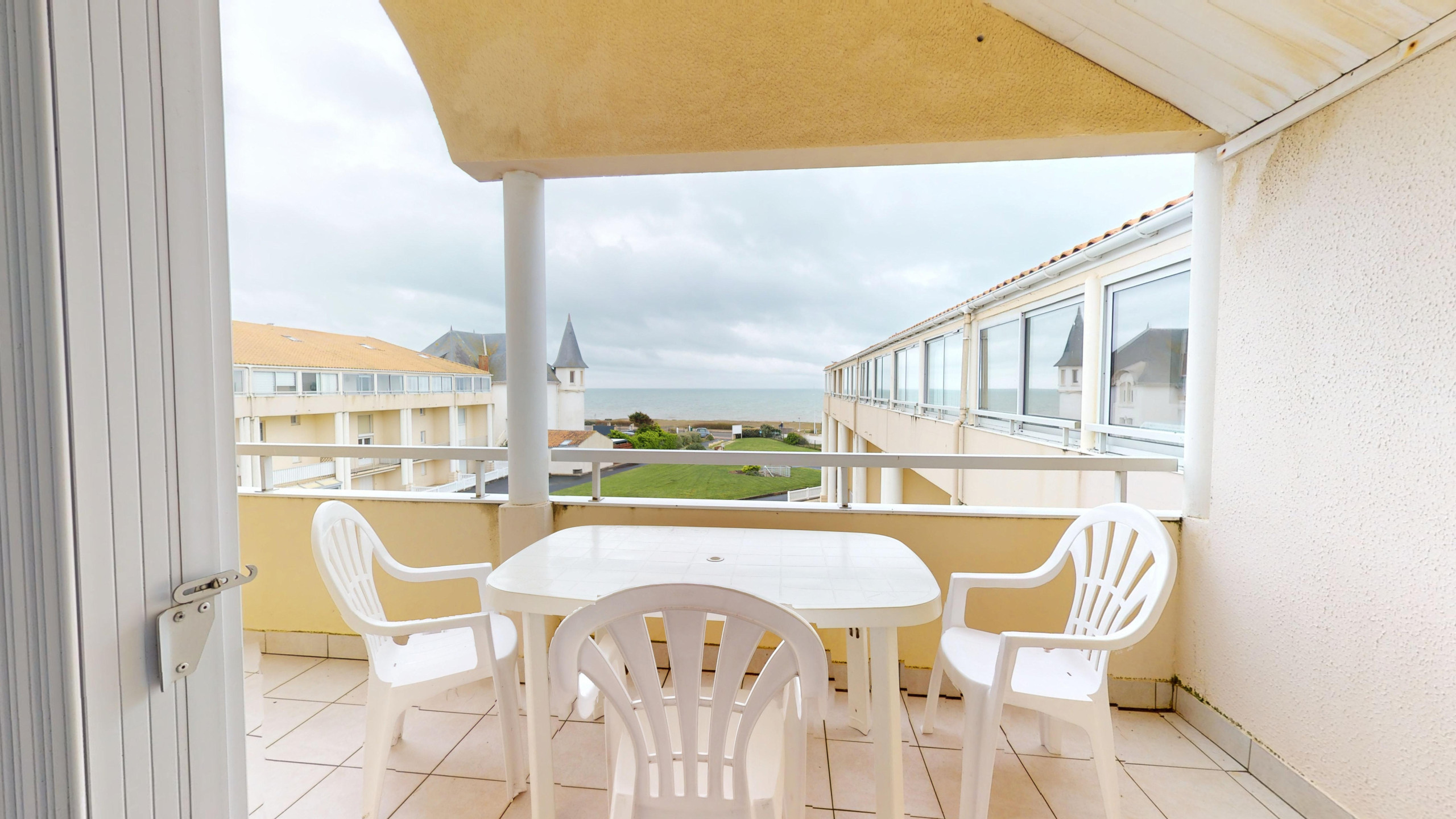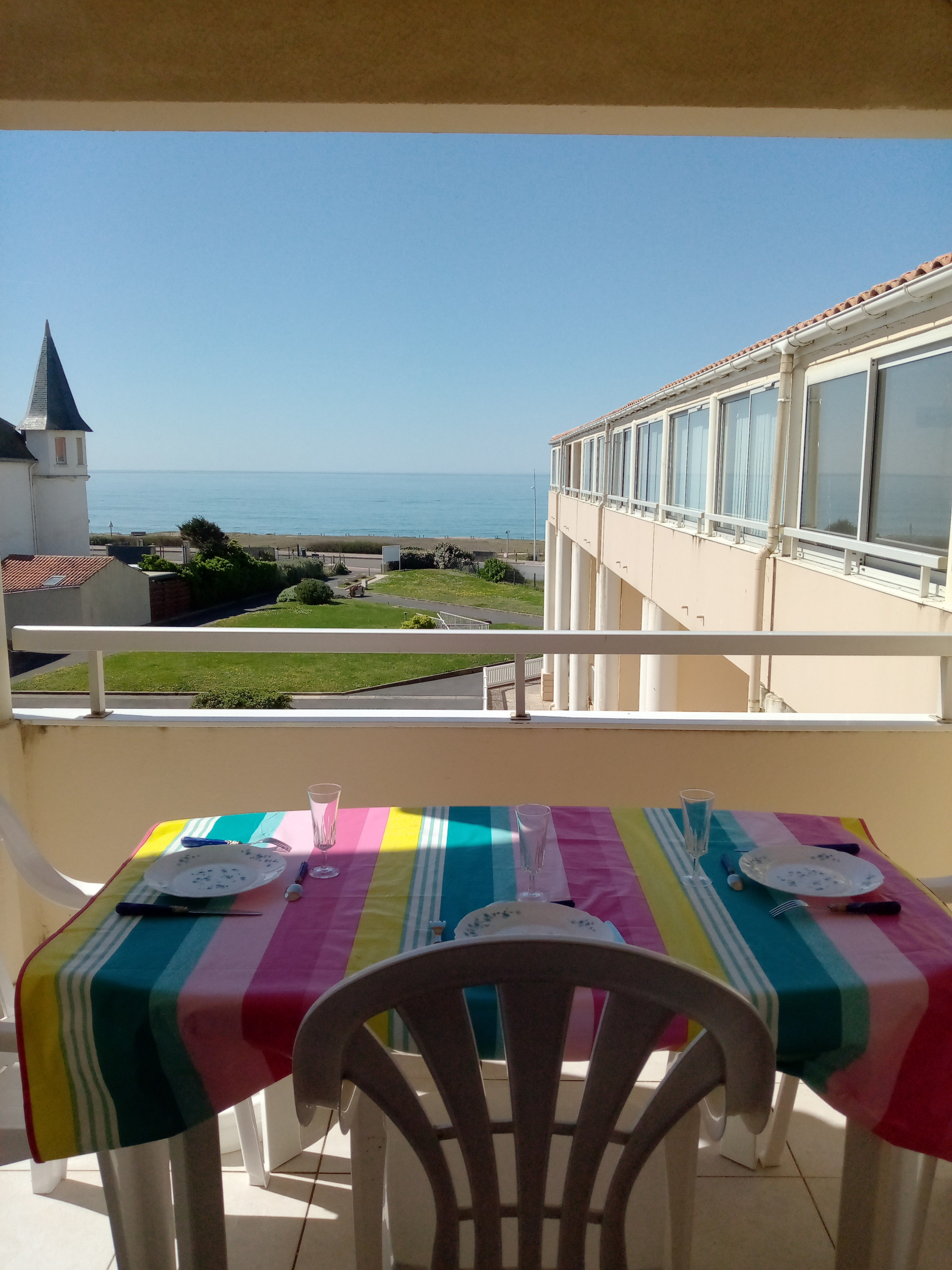 Le point fort de cet appartement reste son superbe balcon équipé de mobilier de jardin. Installé directement face à la mer, c'est l'endroit rêvé pour savourer votre petit-déjeuner en contemplant les vagues ou pour admirer les couchers de soleil flamboyants sur l'Atlantique. Un véritable poste d'observation privé pour vivre au rythme des marées.