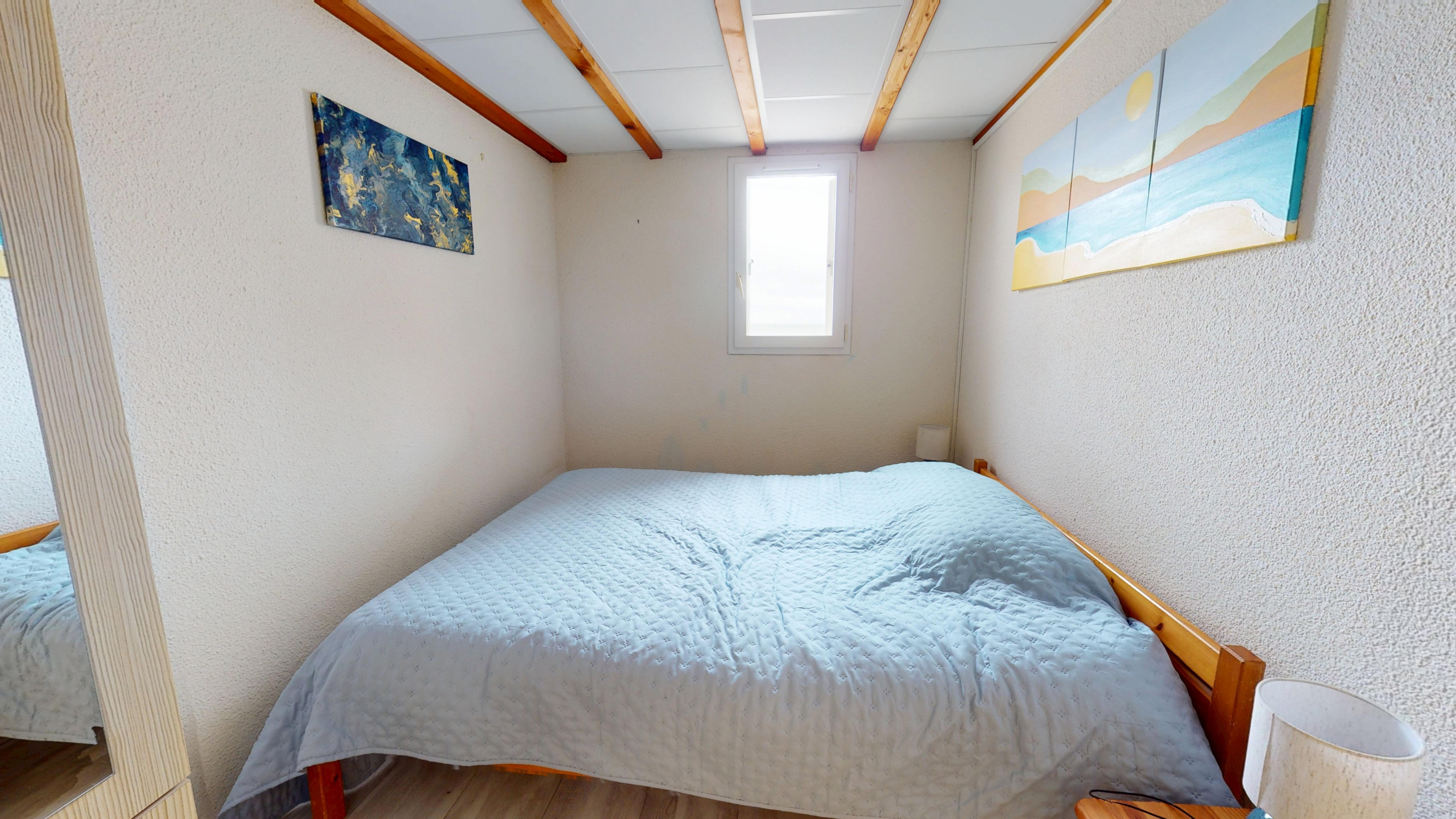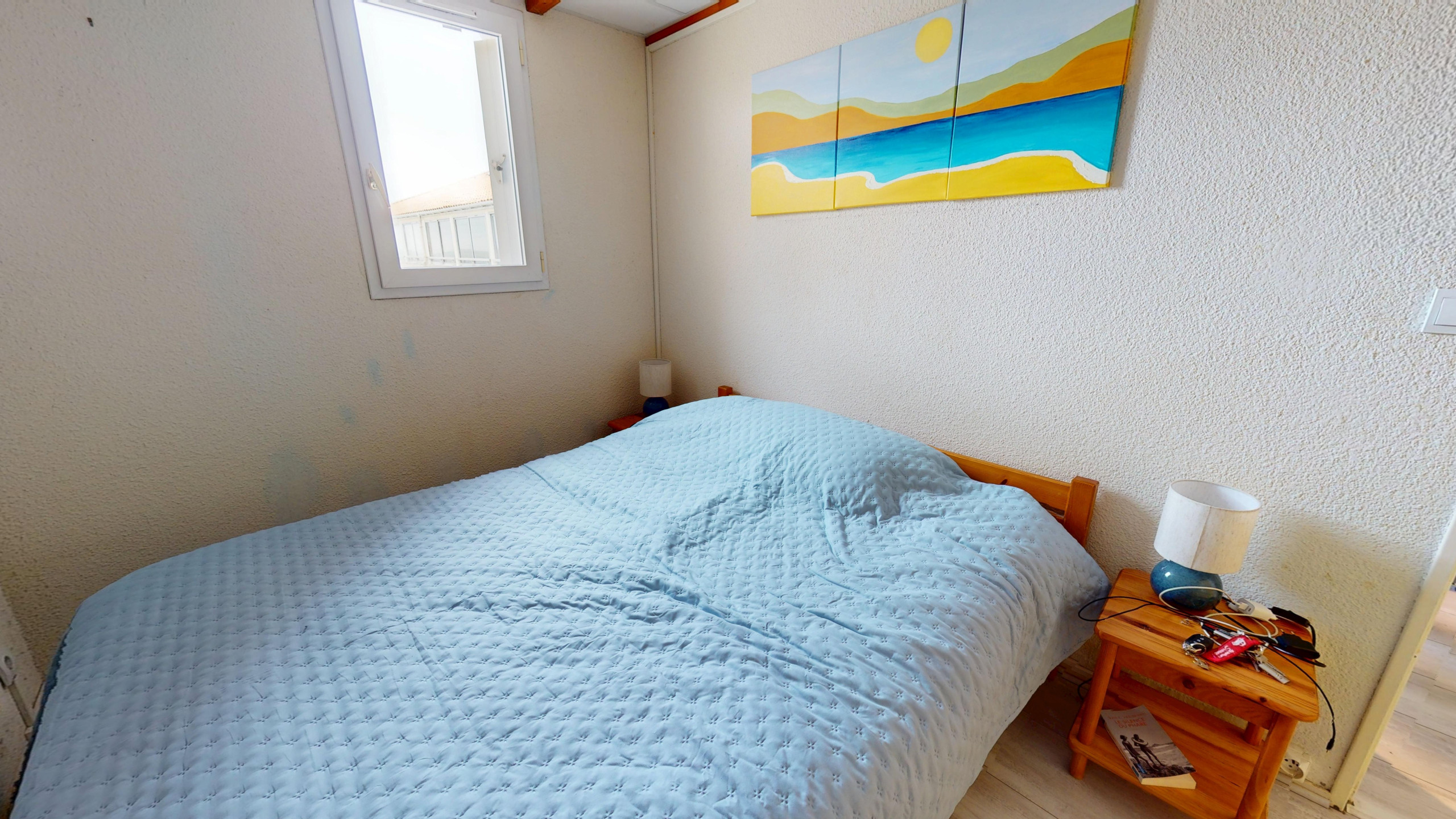 Le logement comprend une chambre confortable avec un lit double 140x190, parfaite pour des nuits reposantes. Dans le séjour, un canapé-lit double 140x190 permet d’accueillir deux couchages supplémentaires. Le petit salon cosy, équipé d’une télévision, invite à la détente après une journée à la plage.