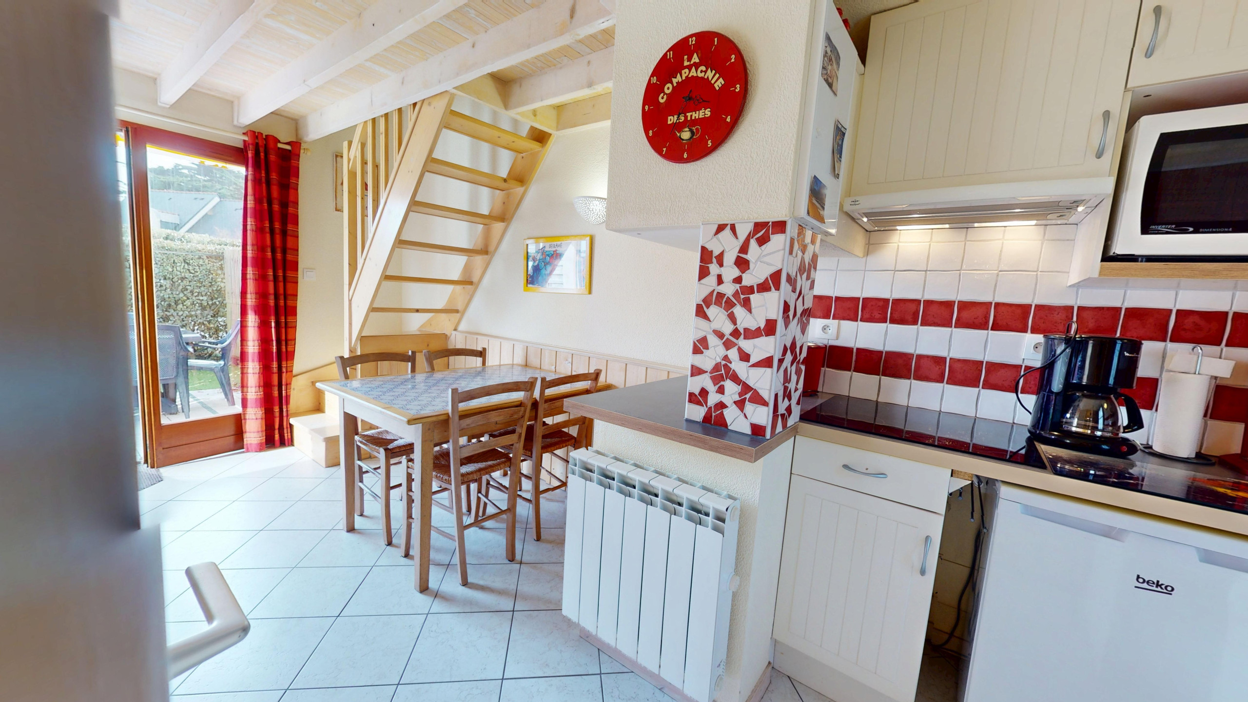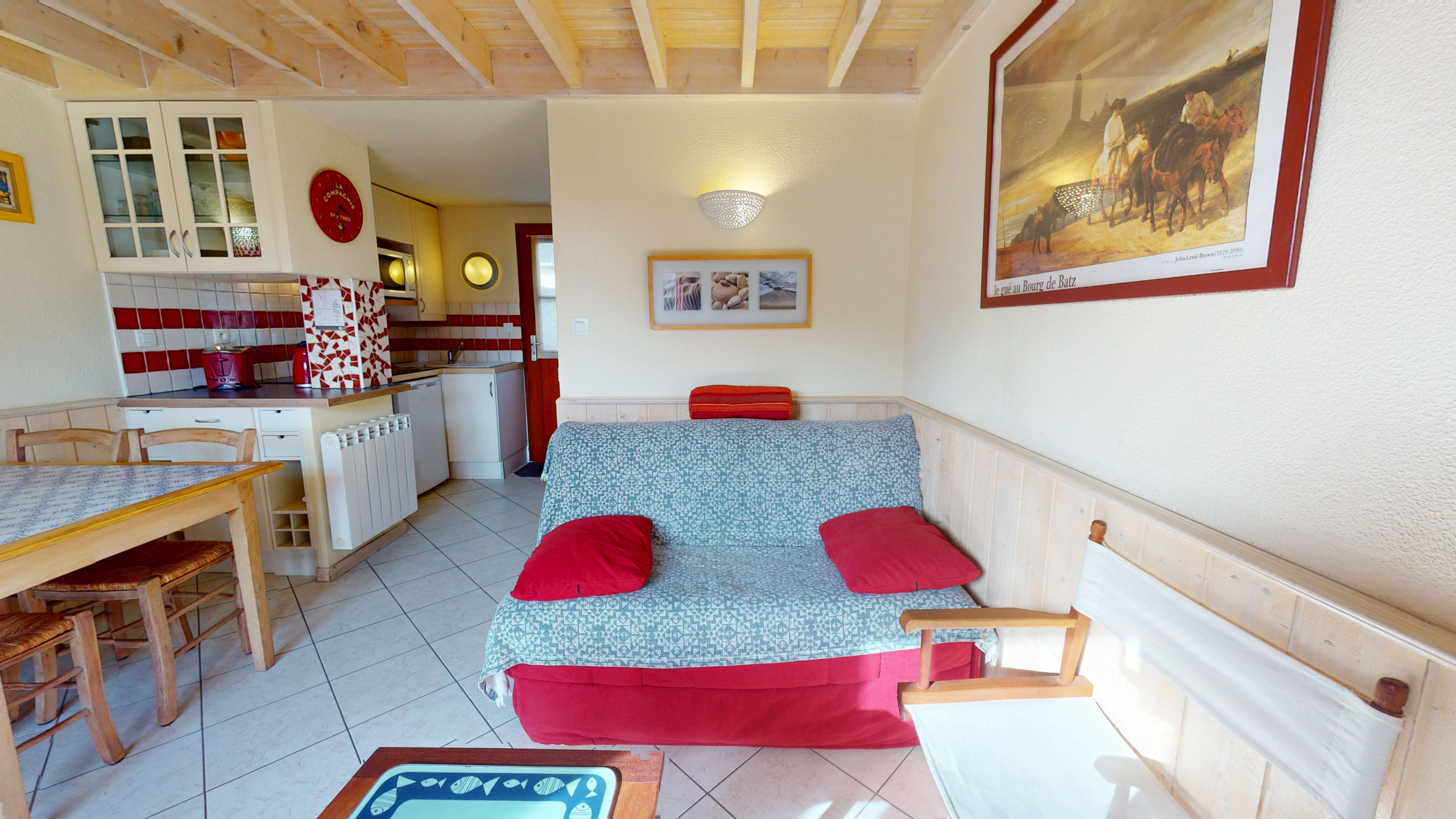 Dès l'entrée, vous découvrirez une pièce de vie lumineuse et conviviale. Le salon, équipé d'une télévision et d'un canapé-lit double (140x190), invite à la détente après une journée de plage. L’espace repas dispose d’une jolie table à manger, jouxtant une charmante cuisine ouverte et fonctionnelle, équipée du nécessaire et de plaques à induction pour préparer vos repas de vacances.