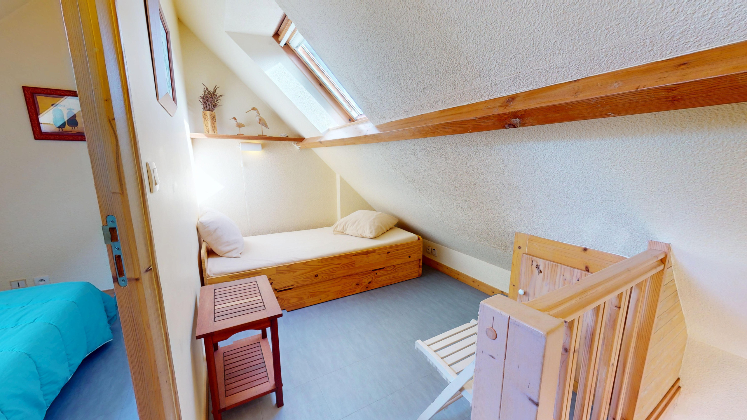 Espace nuit à l'étage : Pour plus d'intimité, l'étage est dédié au repos avec une chambre disposant d'un lit double (140x190) et une mezzanine attenante avec un lit simple (90x190).
