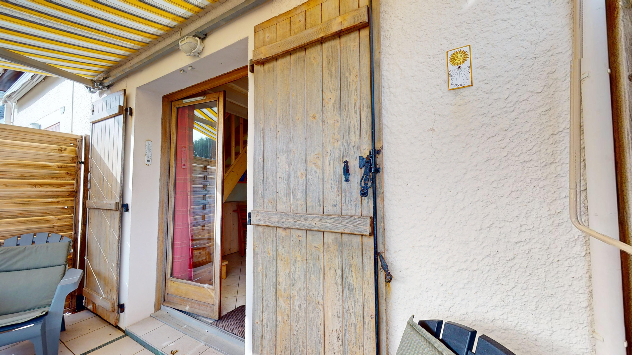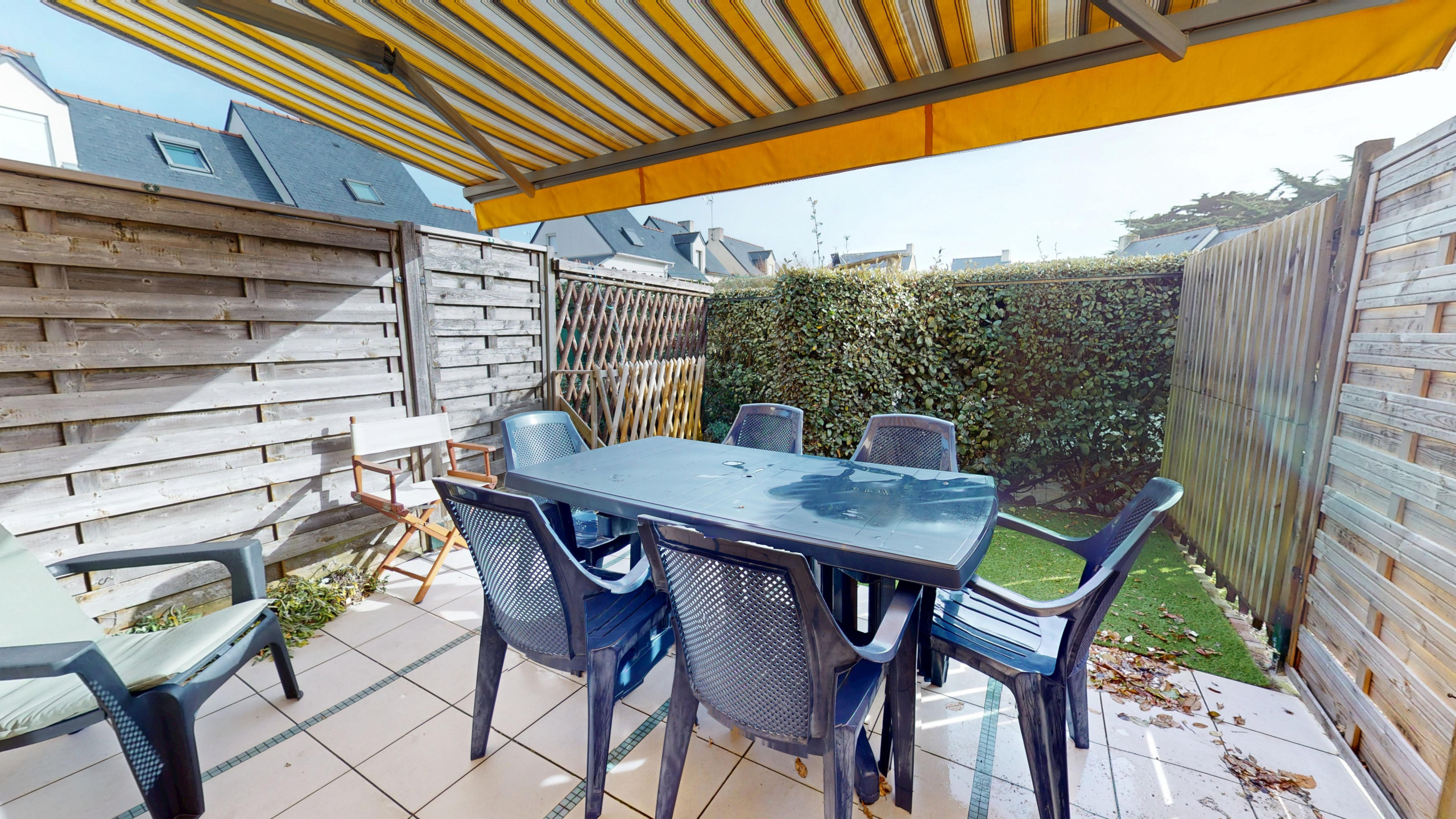 Extérieur privilégié : Profitez d'une jolie terrasse assez spacieuse équipée de mobilier de jardin et d'un store banne, idéale pour vos petits-déjeuners au grand air.
