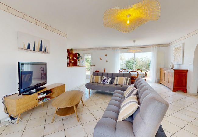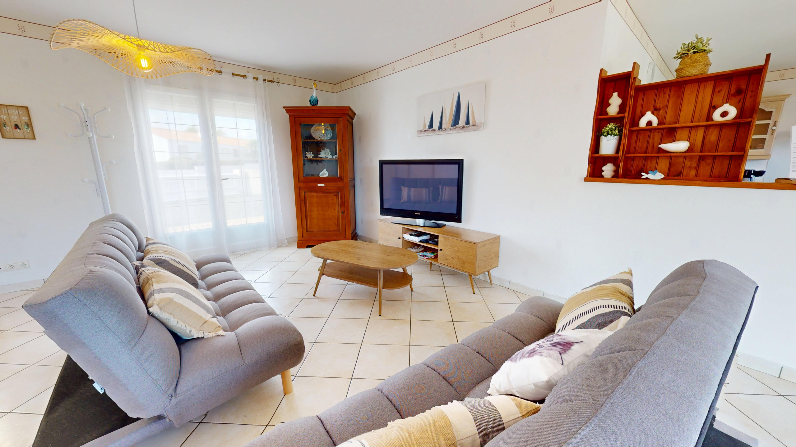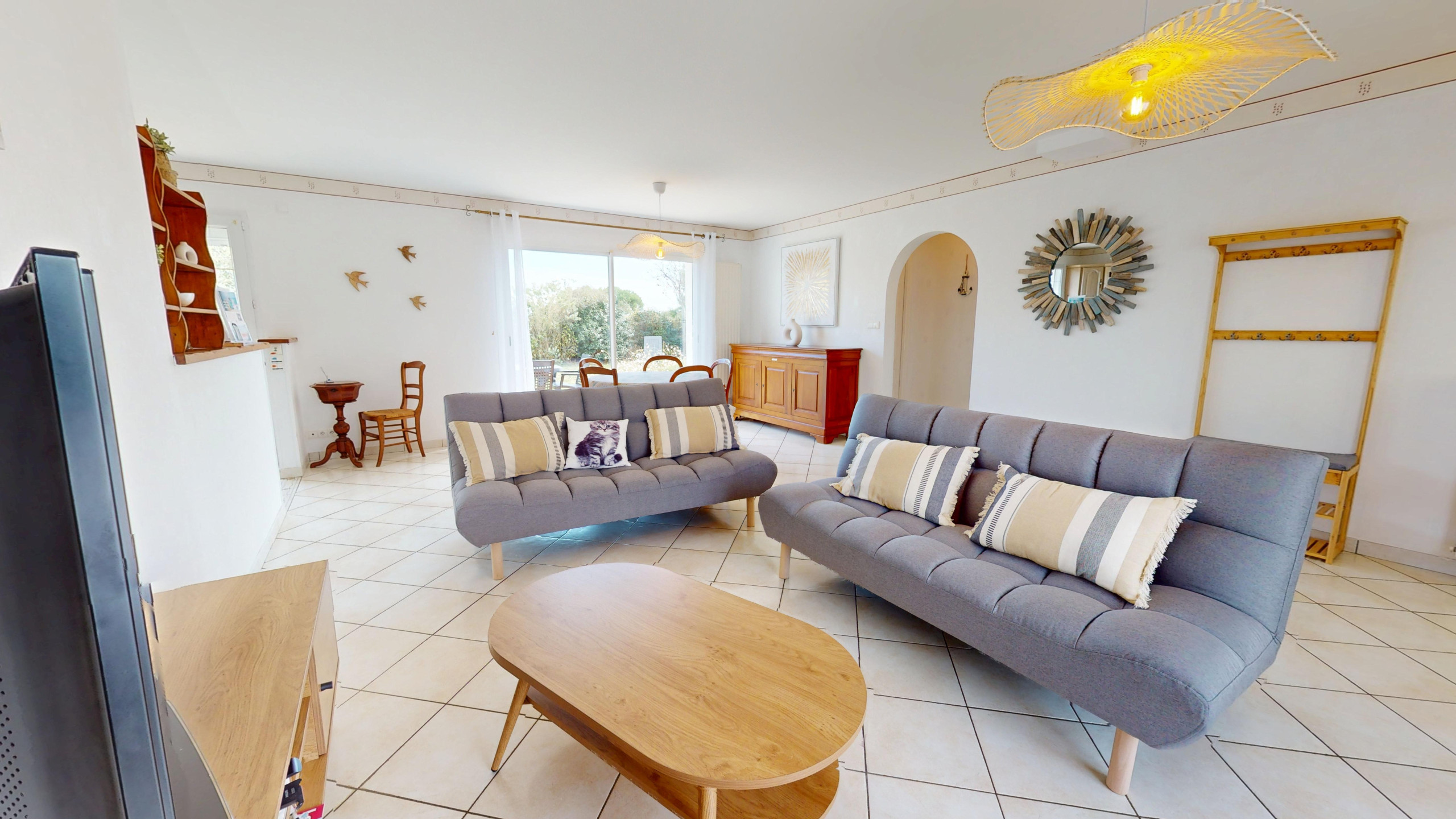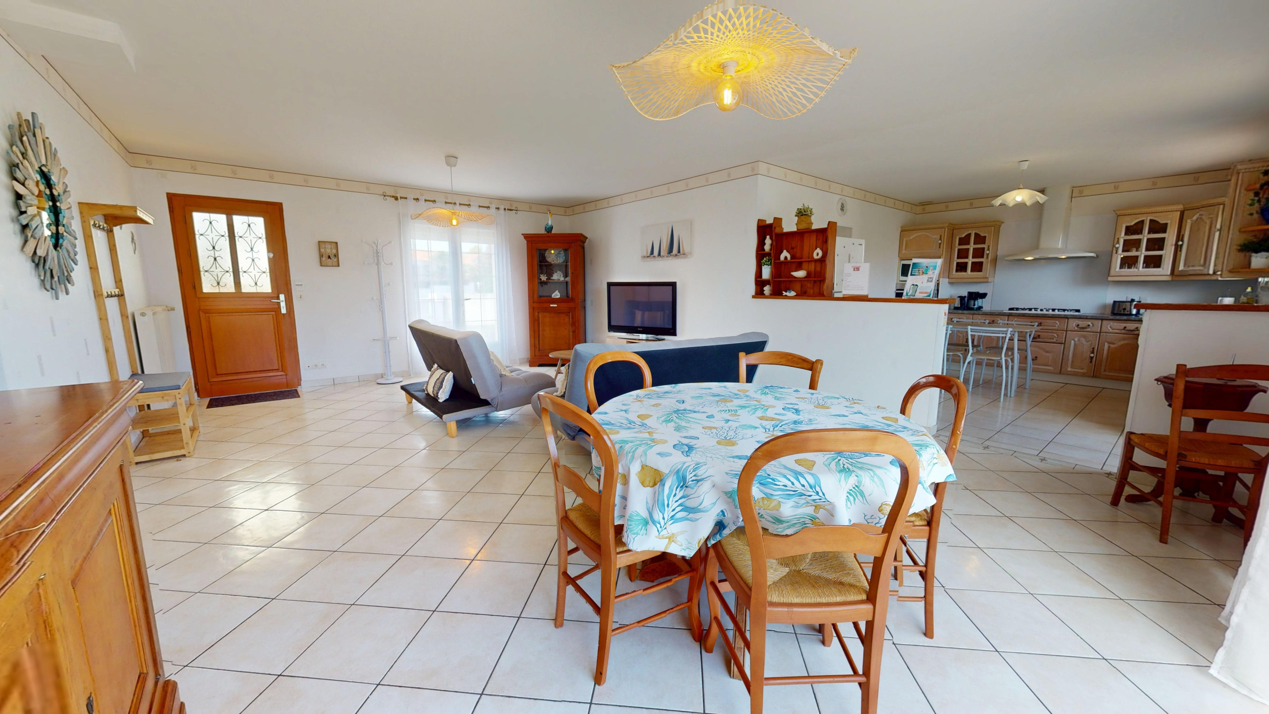 Séjour convivial : Canapé d'angle, TV, grande table à manger... Parfait pour des moments de partage en famille ou entre amis.