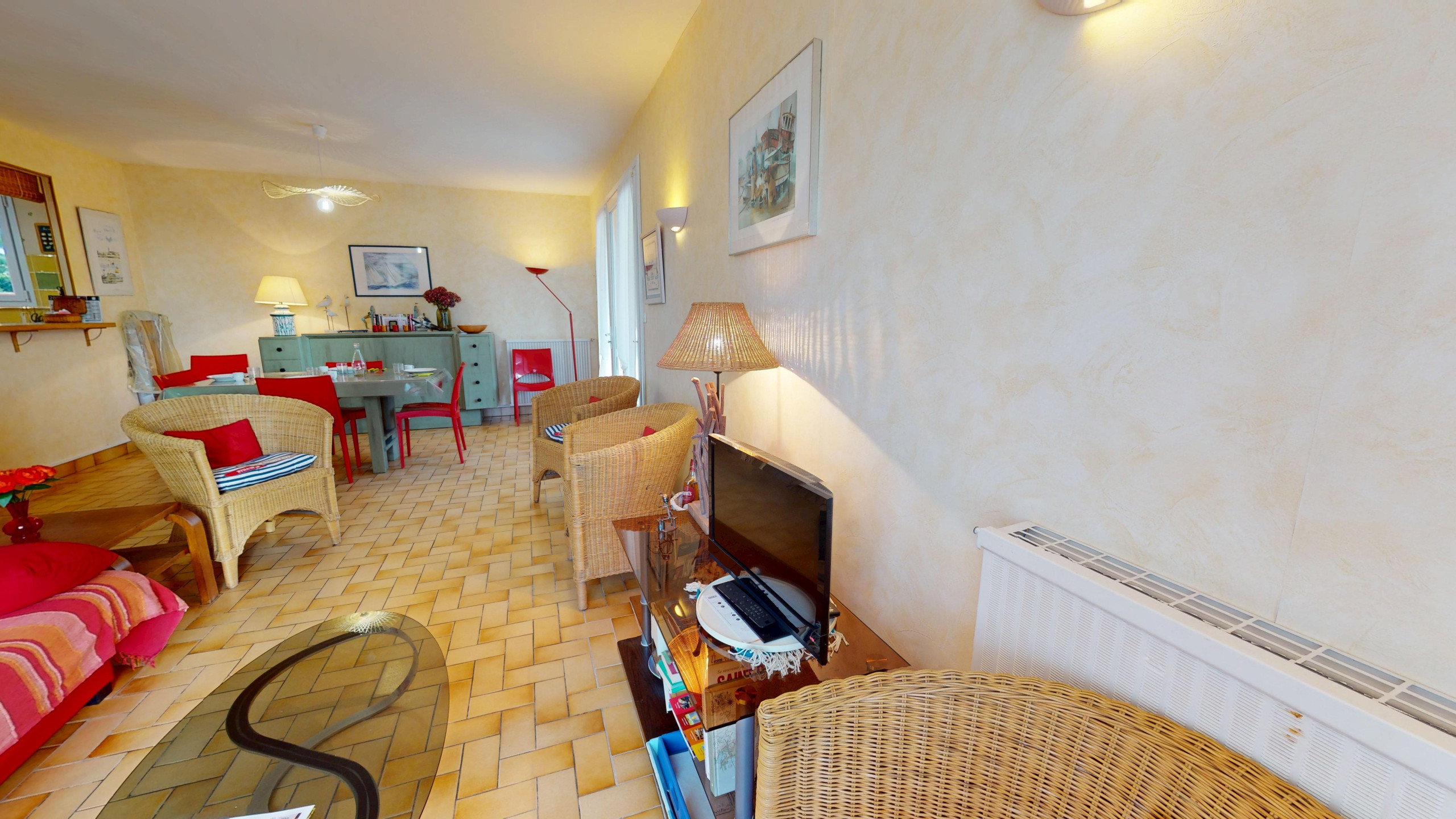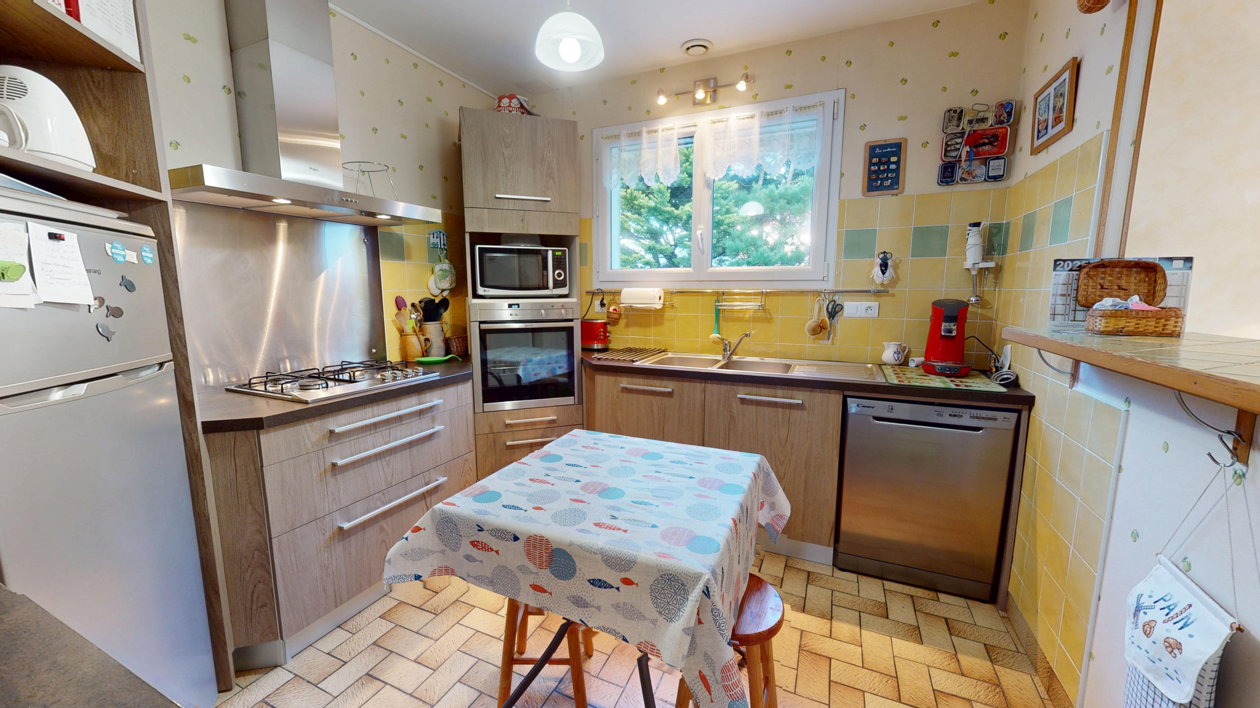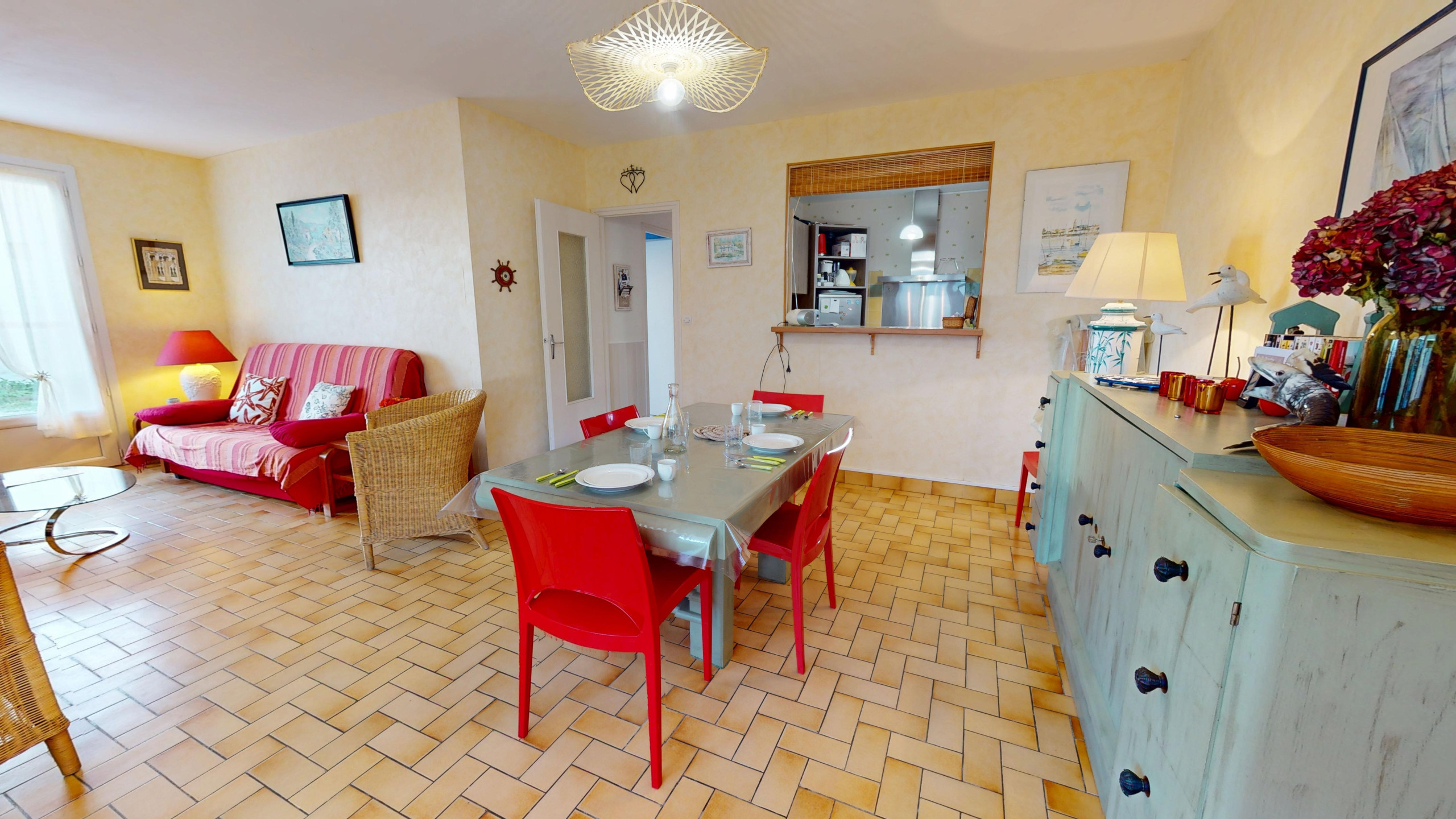 Le grand séjour baigné de lumière regroupe une salle à manger conviviale et un coin salon confortable équipé d’une télévision. La cuisine indépendante, entièrement aménagée et équipée, vous permet de préparer vos repas comme à la maison.