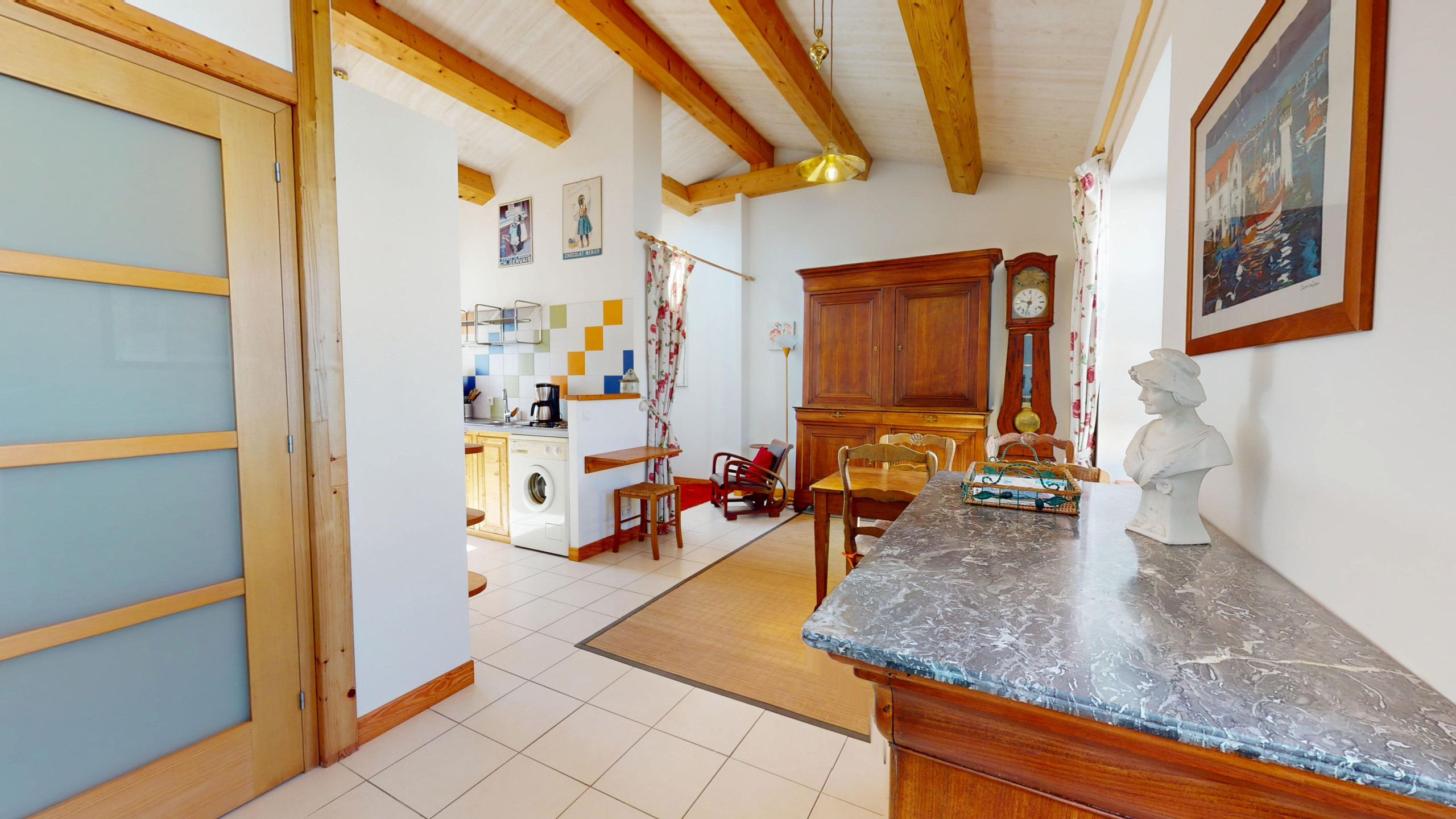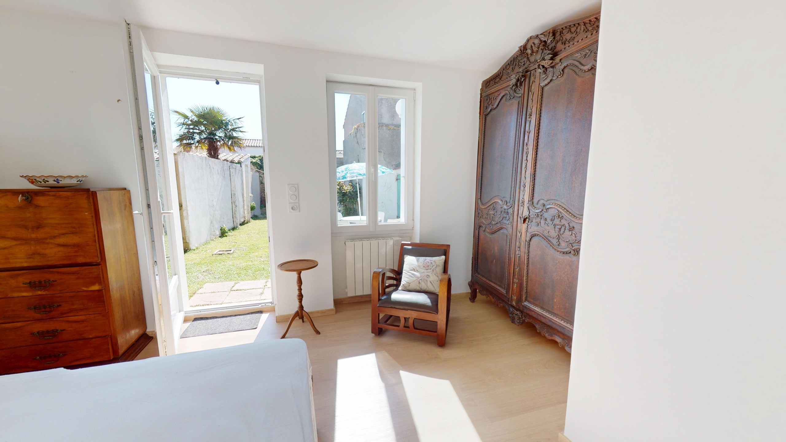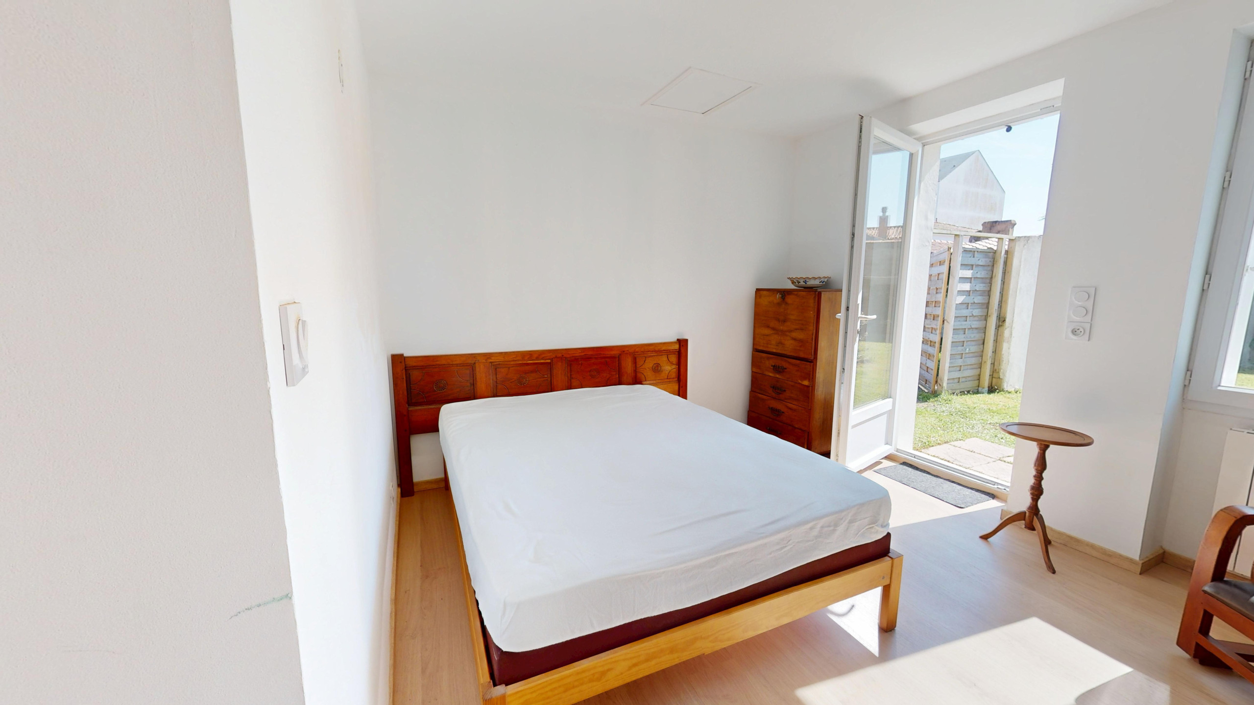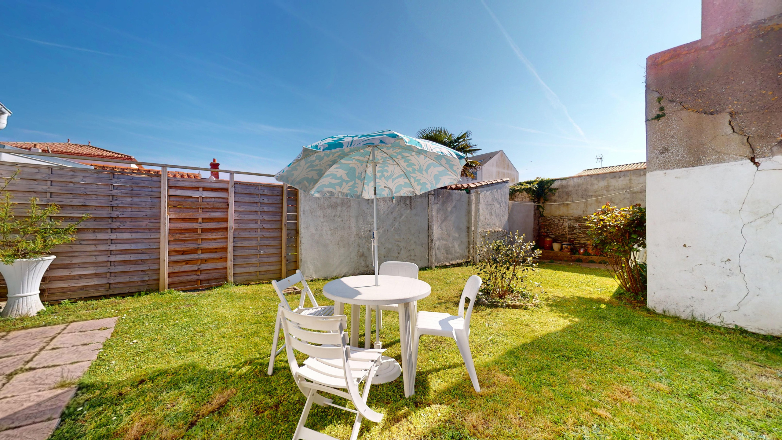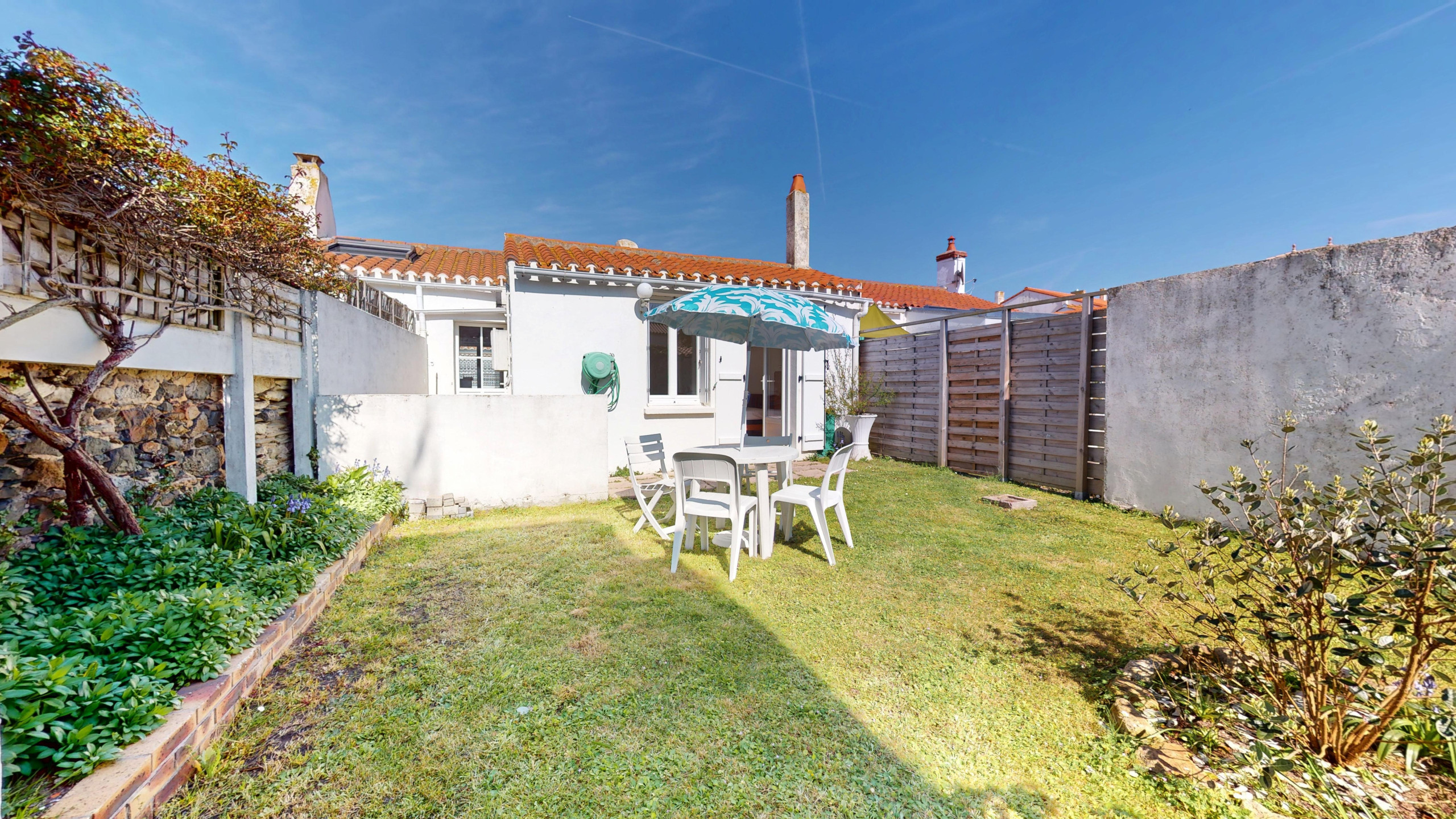- Une terrasse discrète, à l’abri des regards, parfaite pour les repas ou les instants de détente.