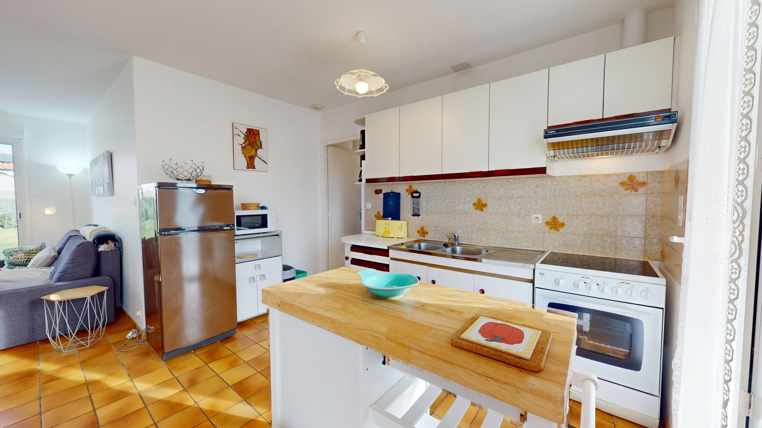 La cuisine ouverte, totalement équipée, dispose de plaques à induction et de tout le nécessaire pour cuisiner comme à la maison. Son petit hublot façon mini-bar permet de créer un espace apéritif très agréable entre la cuisine et la pièce de vie.