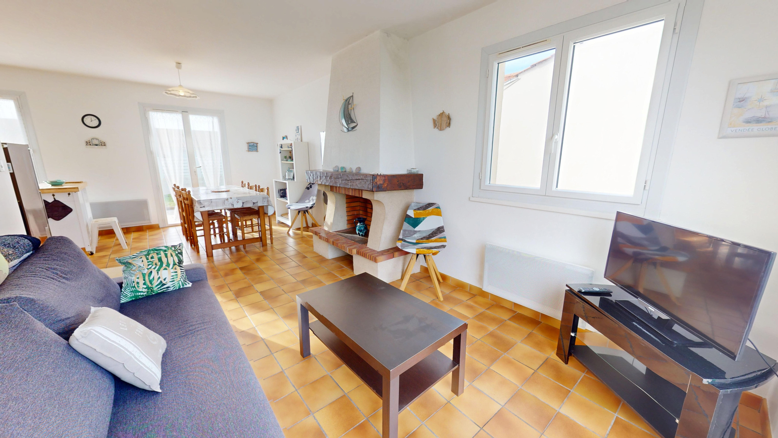 Dès l’entrée, vous découvrez une grande pièce de vie lumineuse composée d’un salon moderne équipé d’une télévision et d’une cheminée décorative (non fonctionnelle) qui apporte une atmosphère particulièrement cosy.