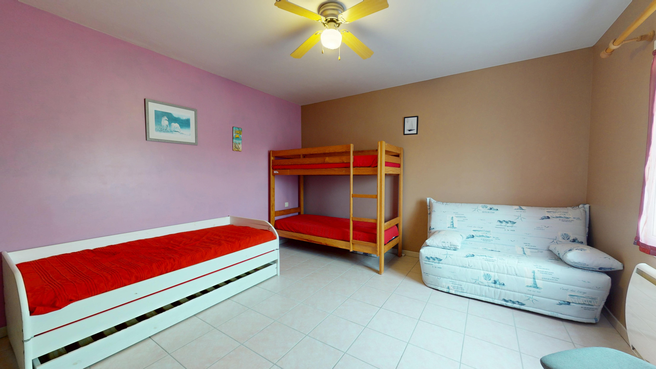 Chambre 1 : Un espace polyvalent comprenant un lit superposé (2 lits simples 90x190), un lit simple supplémentaire et un canapé-lit.
