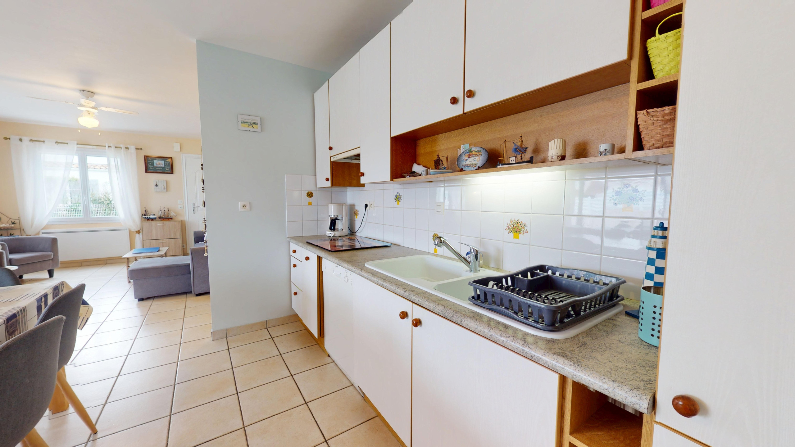 La cuisine ouverte, totalement équipée, dispose de plaques à induction et de tout le nécessaire pour cuisiner comme à la maison. Son petit hublot façon mini-bar permet de créer un espace apéritif très agréable entre la cuisine et la pièce de vie.