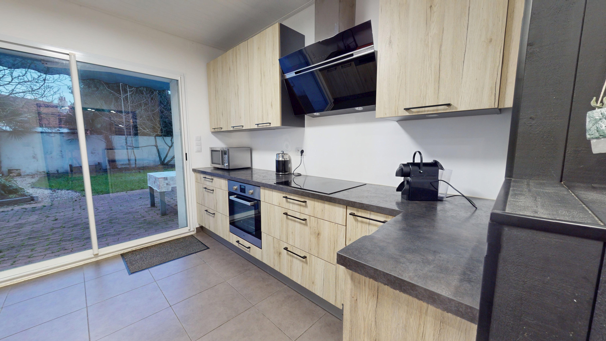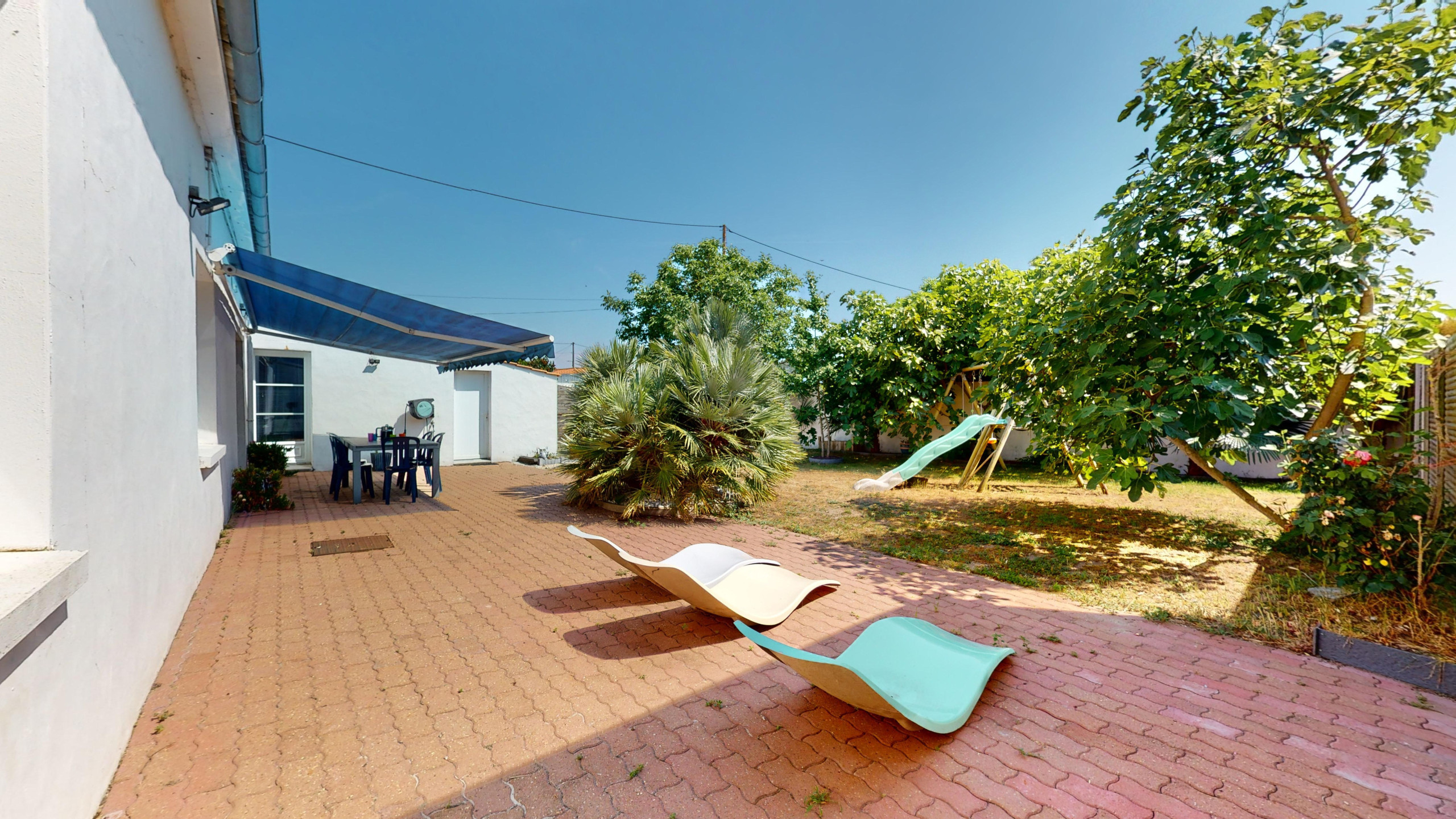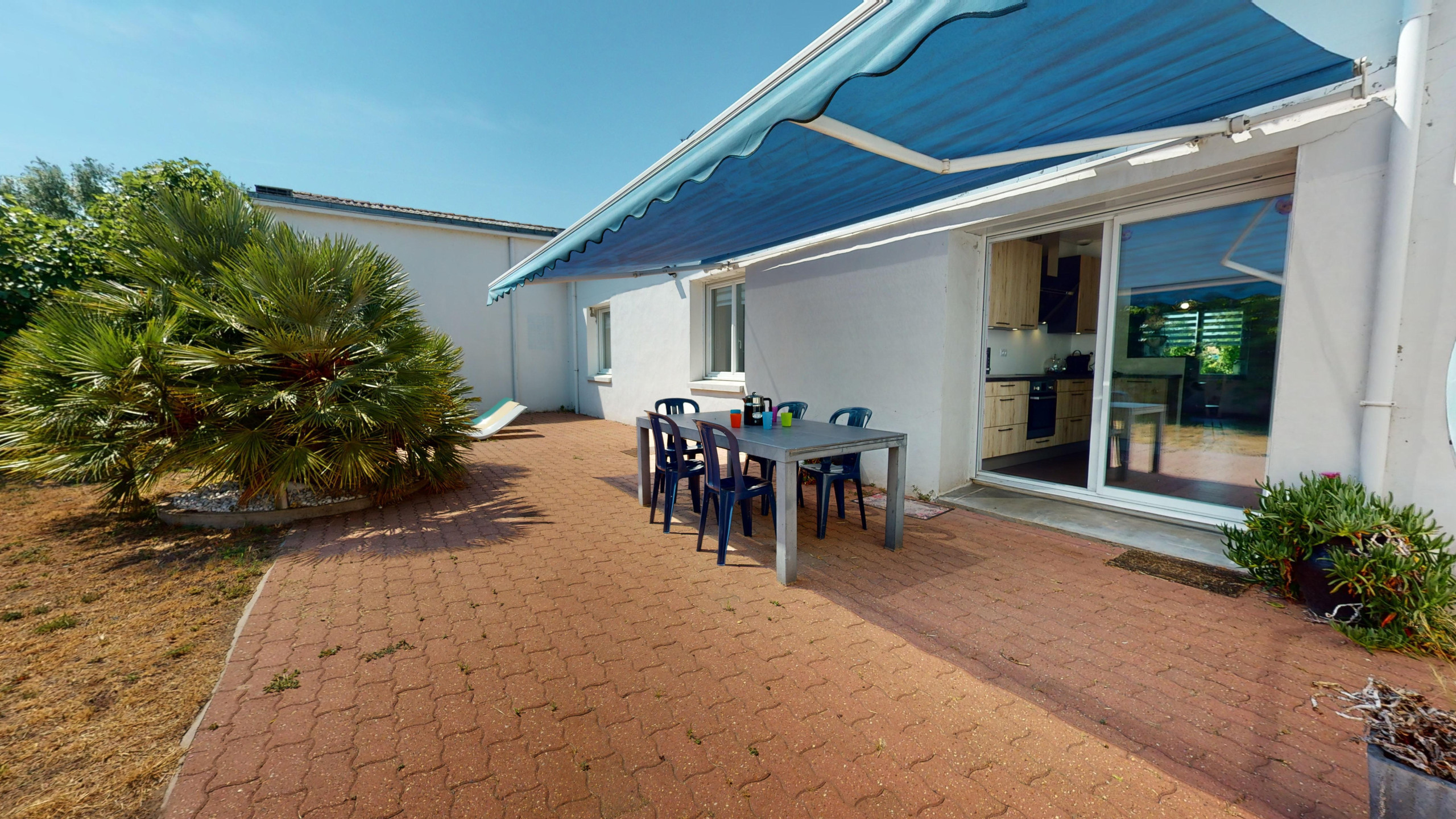 La pièce de vie spacieuse comprend un grand salon avec télévision, qui s’ouvre sur une salle à manger conviviale et un coin avec tables hautes et tabourets situé près de la cuisine entièrement équipée. Vous disposerez également d’un grand garage pour stationner votre véhicule en toute sécurité, ainsi qu’une vaste terrasse extérieure avec store banne électrique, transats pour profiter du soleil et une table de jardin avec chaises pour vos repas en plein air.
