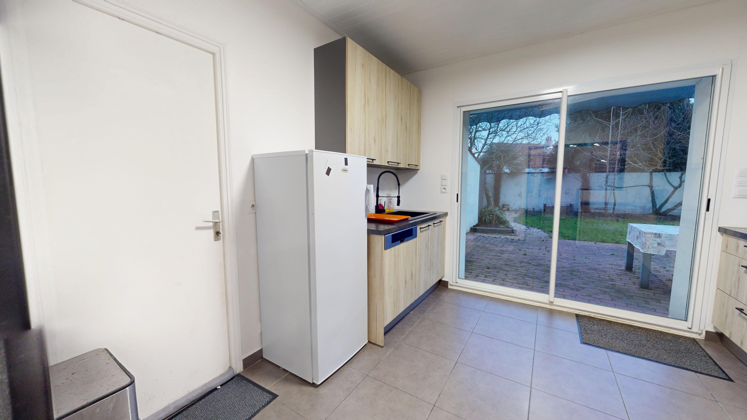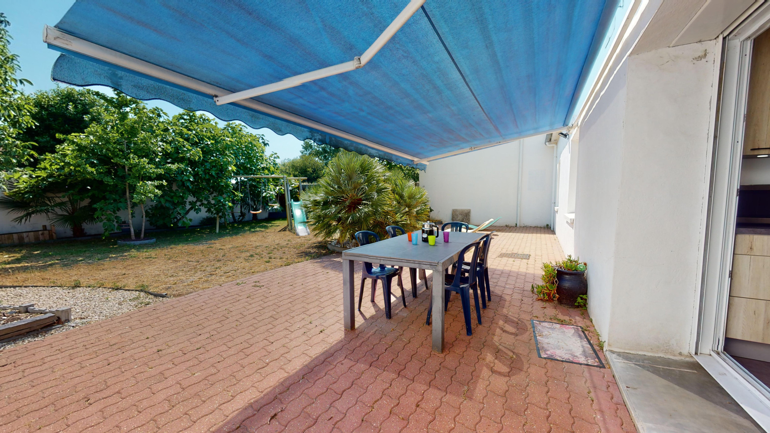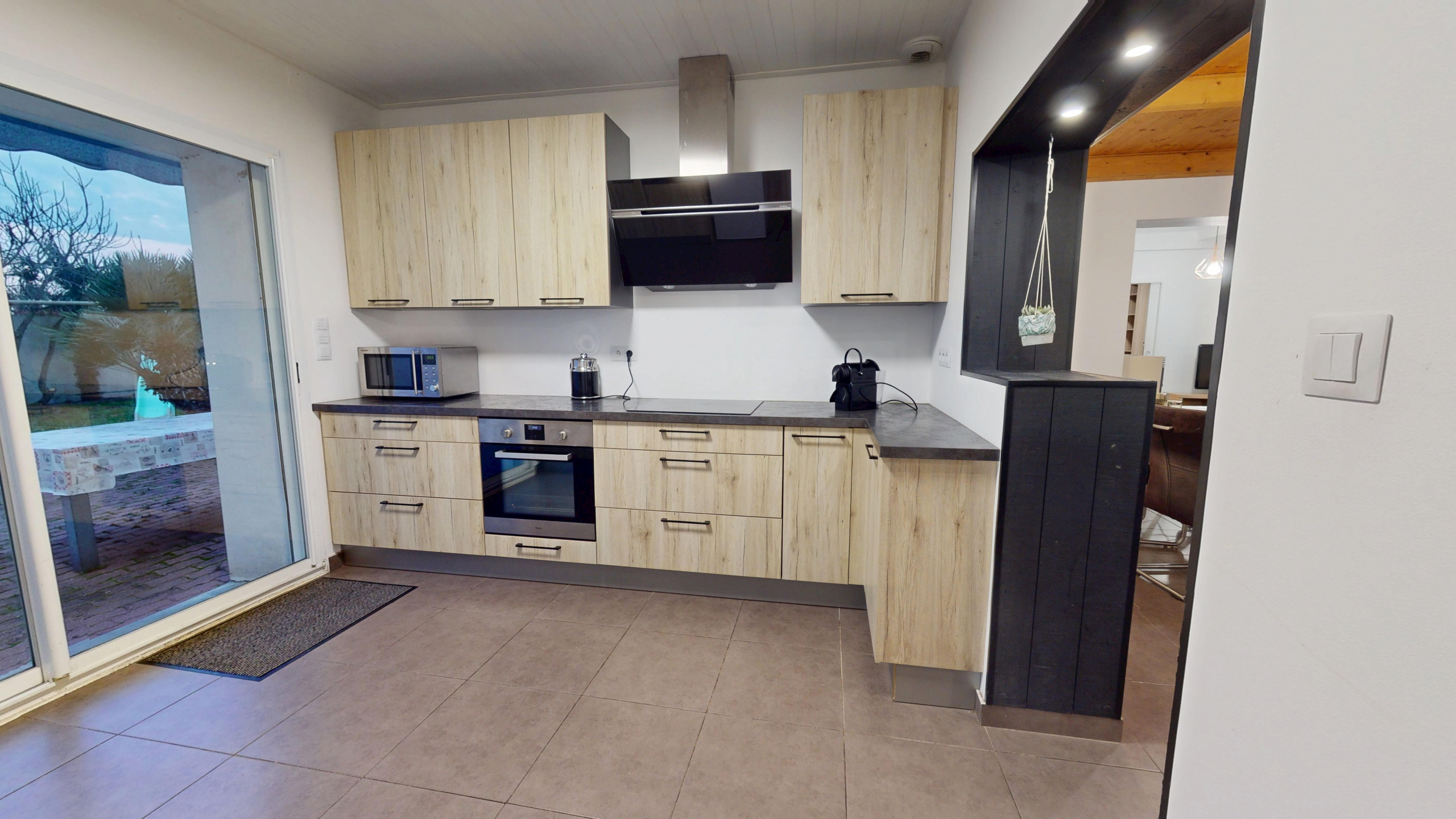 La pièce de vie spacieuse comprend un grand salon avec télévision, qui s’ouvre sur une salle à manger conviviale et un coin avec tables hautes et tabourets situé près de la cuisine entièrement équipée. Vous disposerez également d’un grand garage pour stationner votre véhicule en toute sécurité, ainsi qu’une vaste terrasse extérieure avec store banne électrique, transats pour profiter du soleil et une table de jardin avec chaises pour vos repas en plein air.