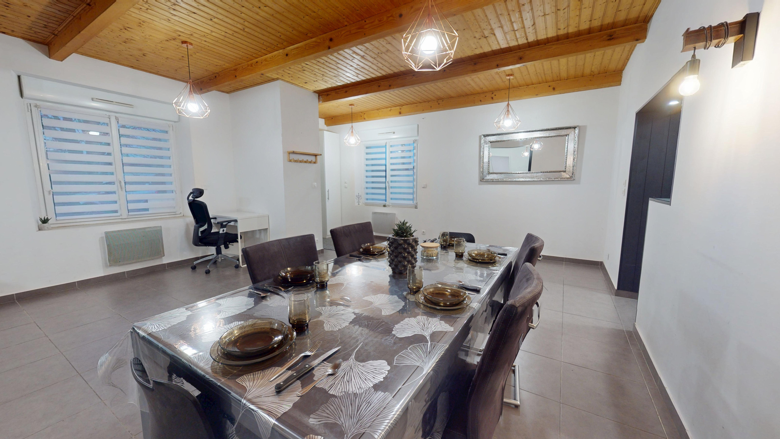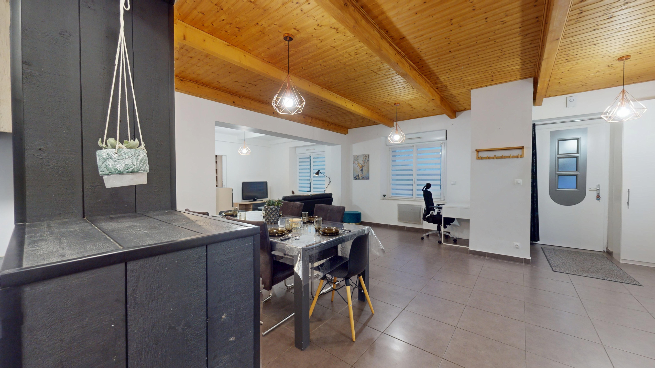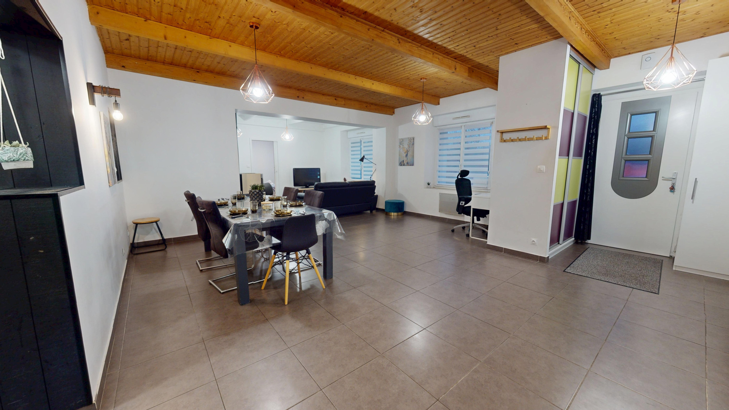 Dès l’entrée, vous découvrez une grande salle à manger moderne avec sa belle table familiale et un coin bureau, parfaite pour partager vos repas ou télétravailler.