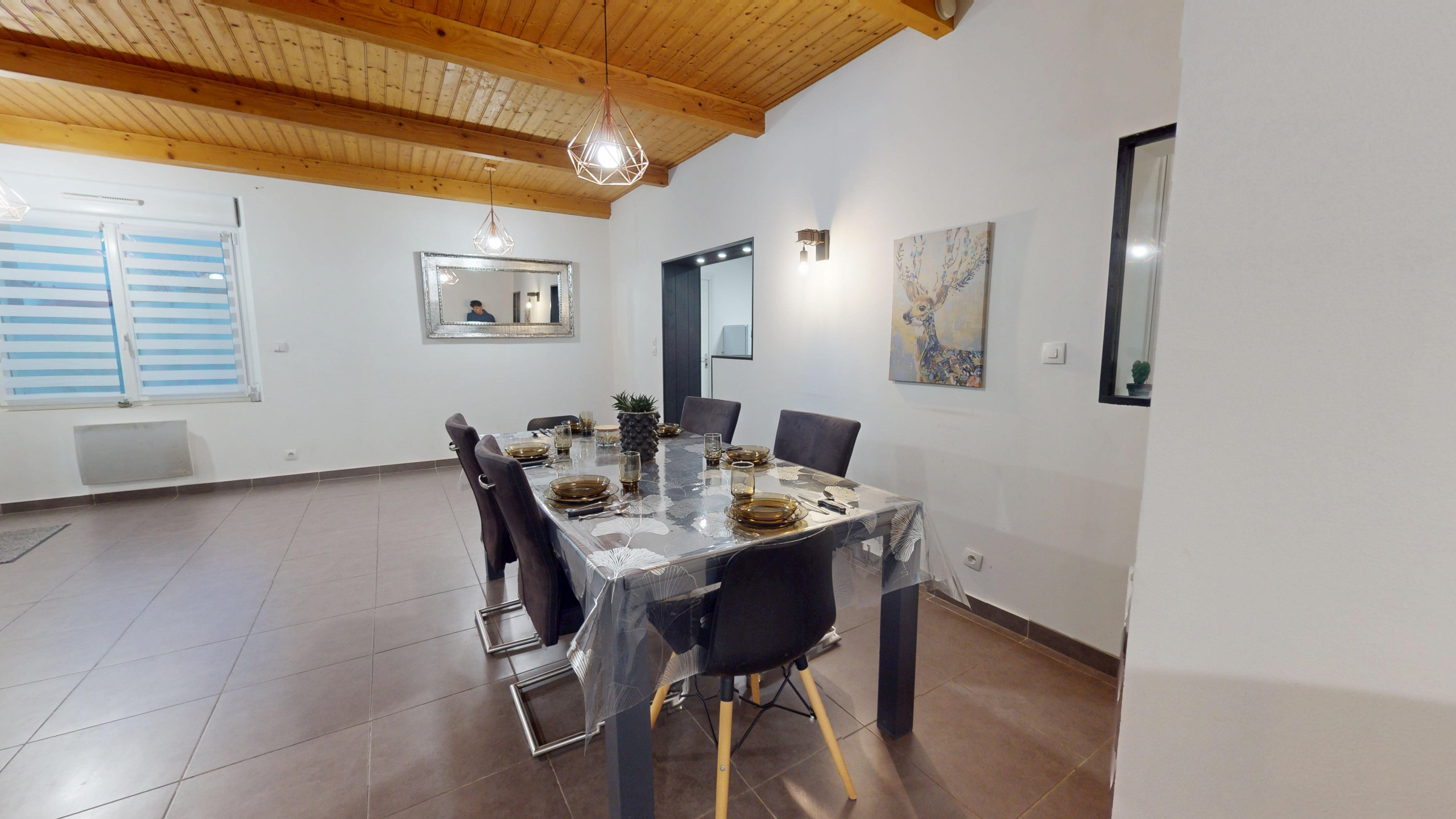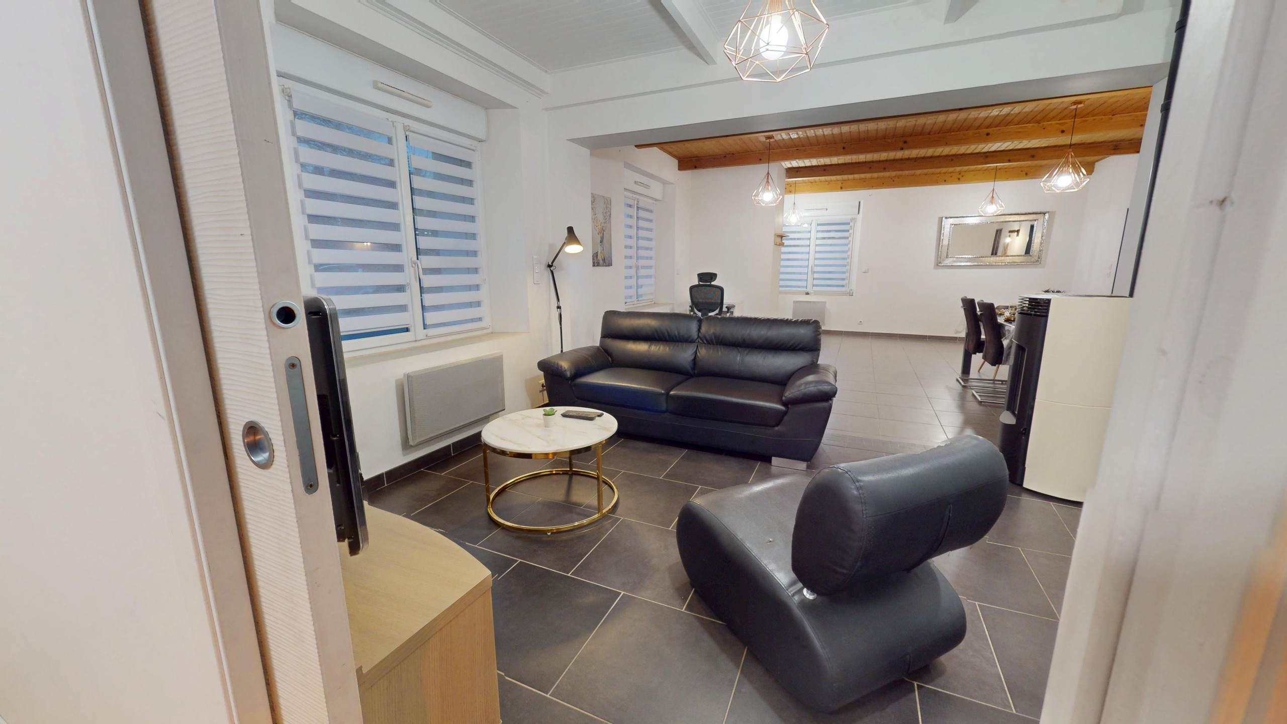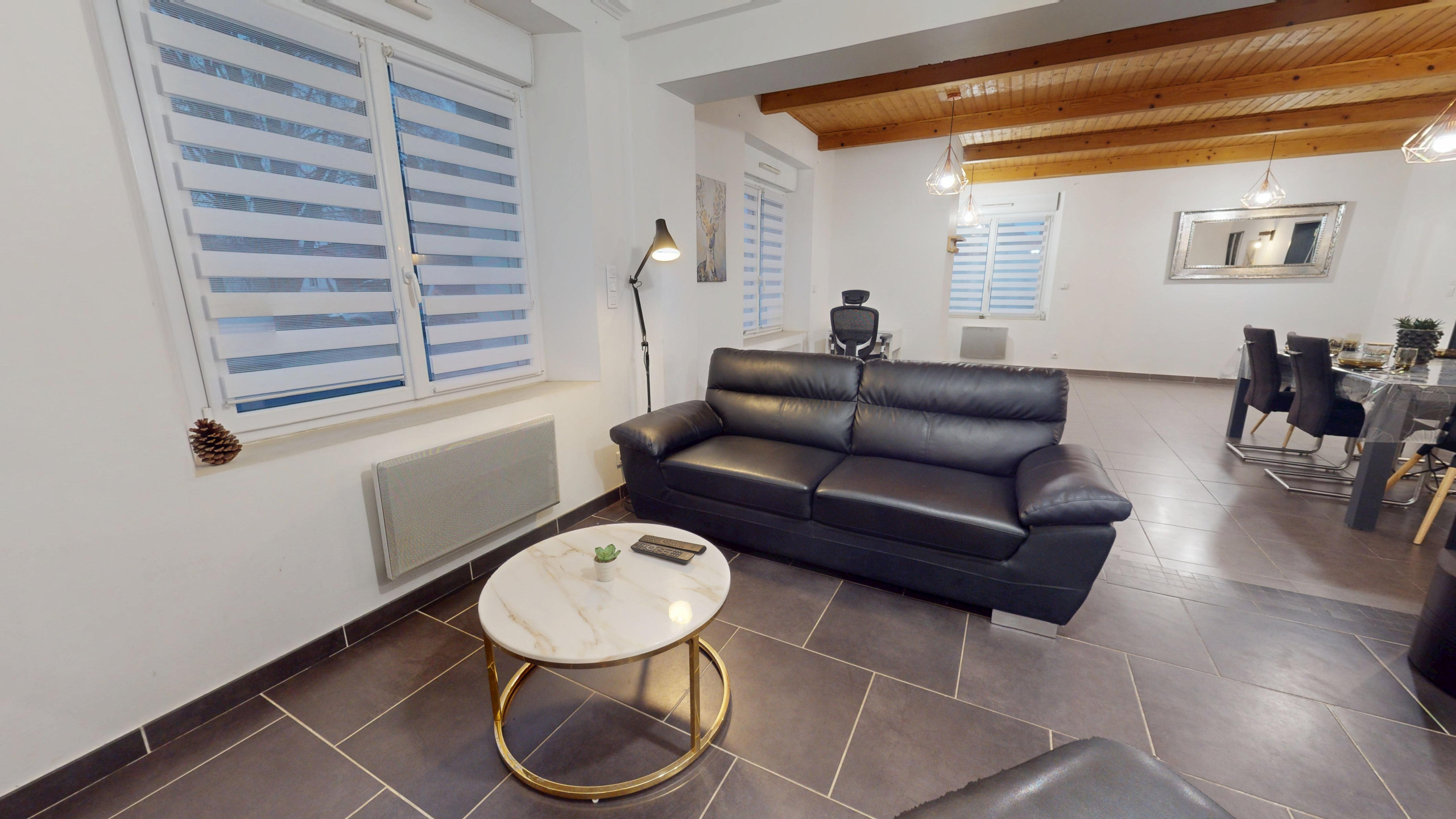 Dès l’entrée, vous découvrez une grande salle à manger moderne avec sa belle table familiale et un coin bureau, parfaite pour partager vos repas ou télétravailler.