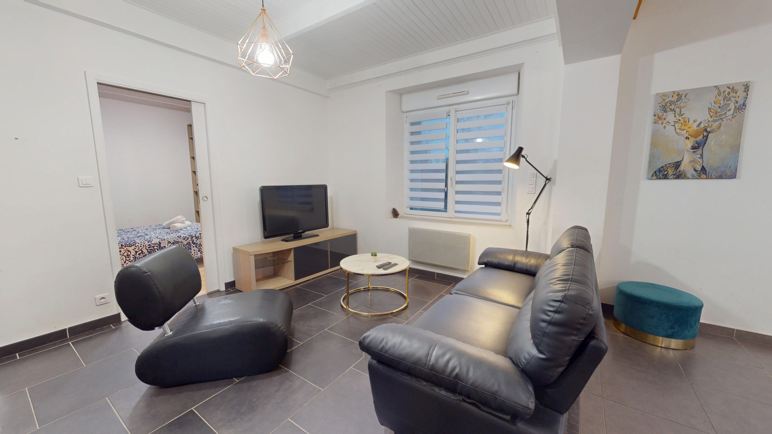 Le salon, cosy et accueillant, dispose de fauteuils, d’un canapé confortable, d’une télévision et d’un poêle à bois, idéal pour vos soirées cocooning.
