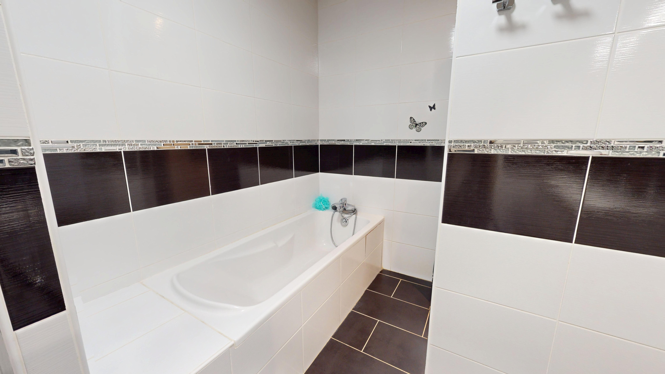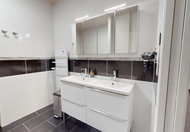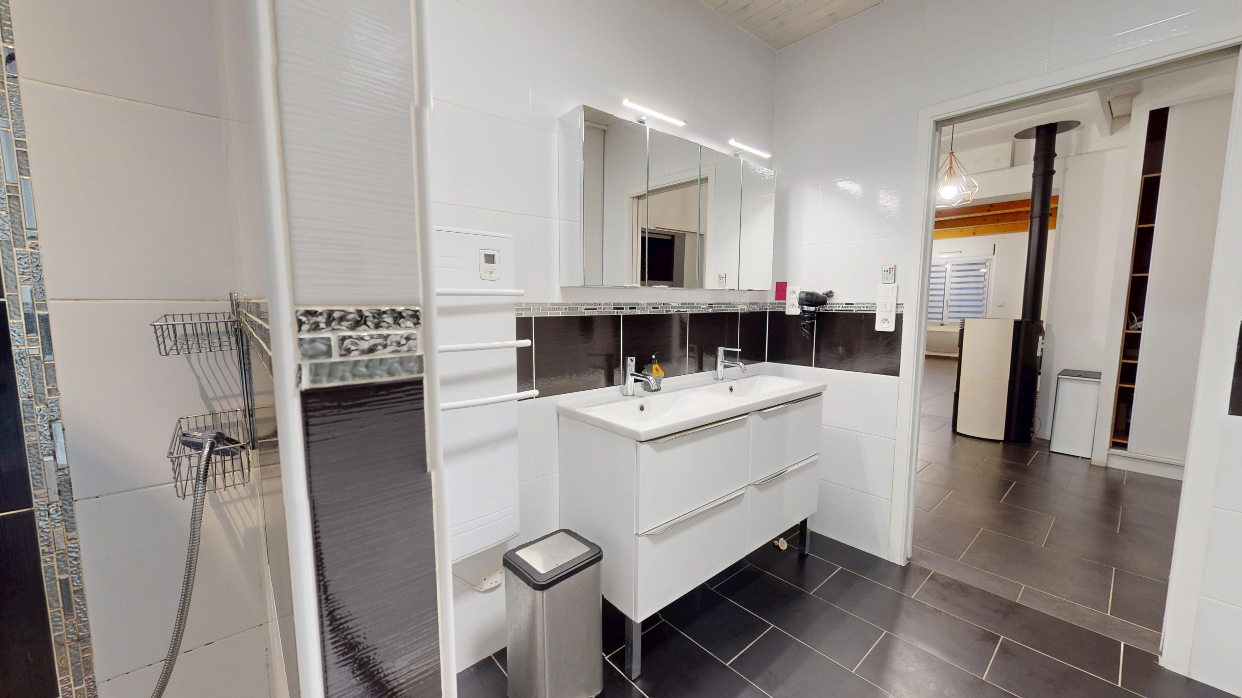 La salle de bain, très moderne, est équipée d’une baignoire, d’une douche et double vasque. Les WC sont séparés pour plus de confort.