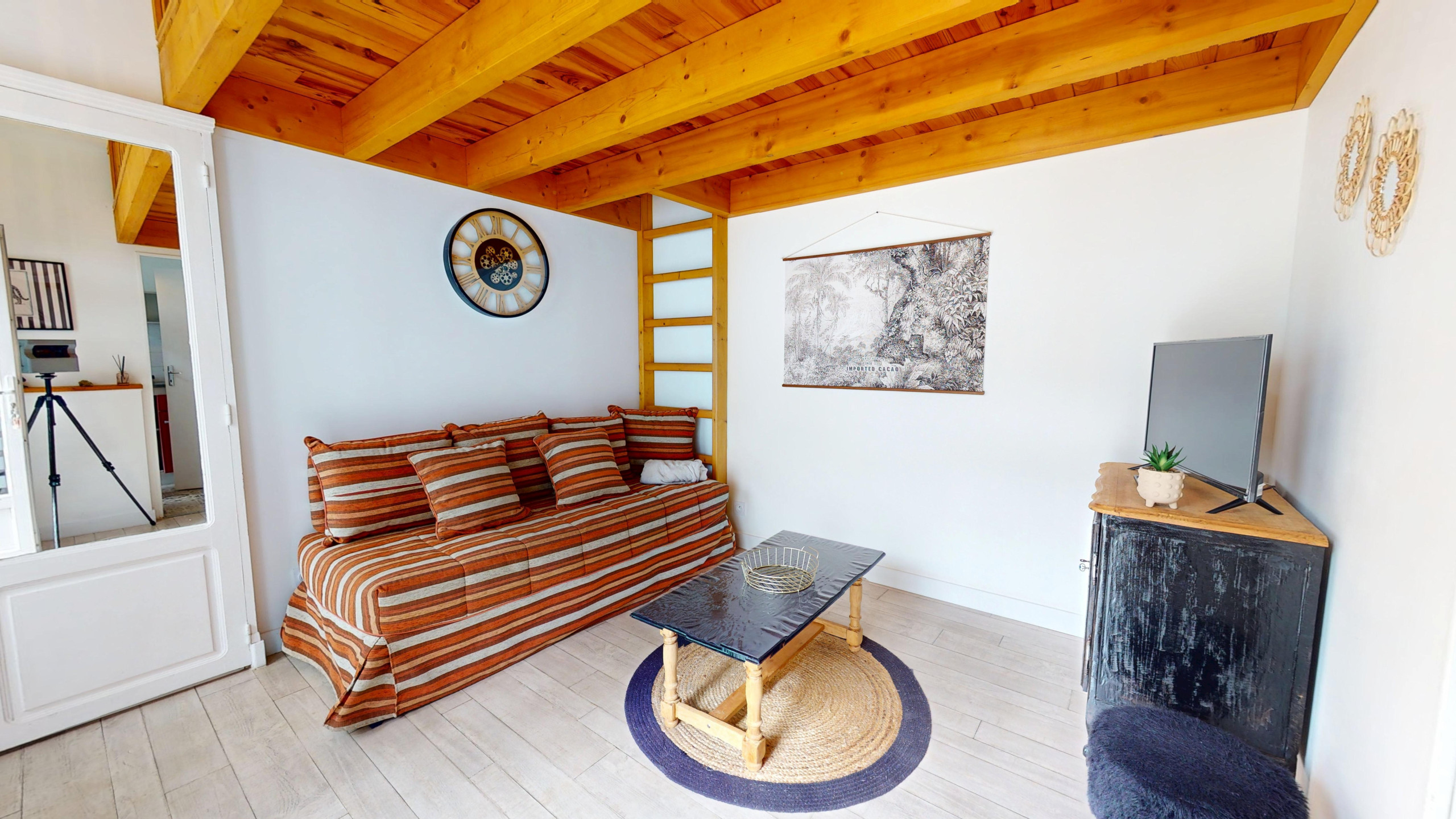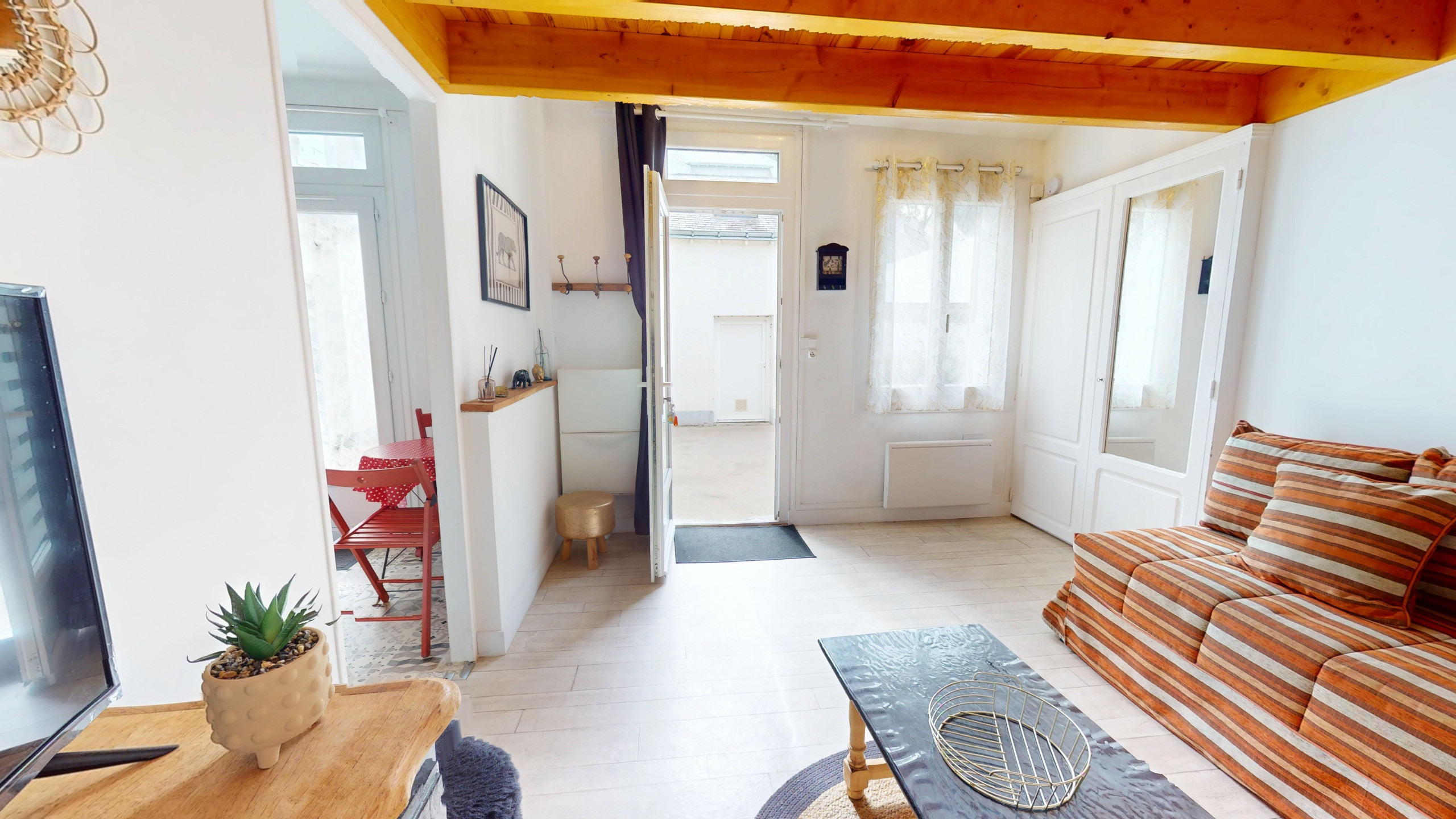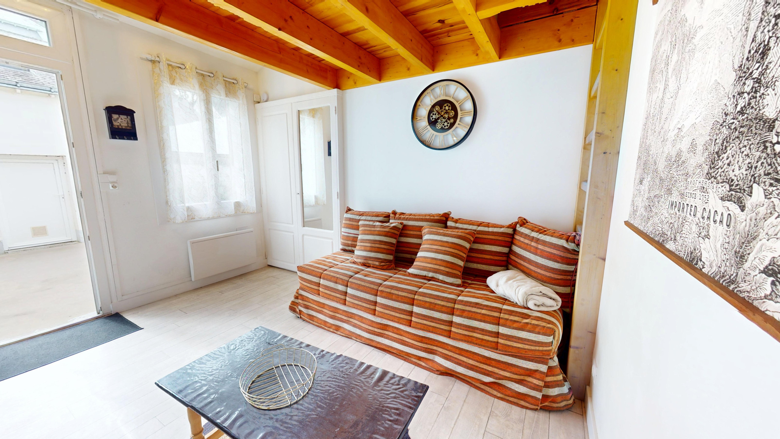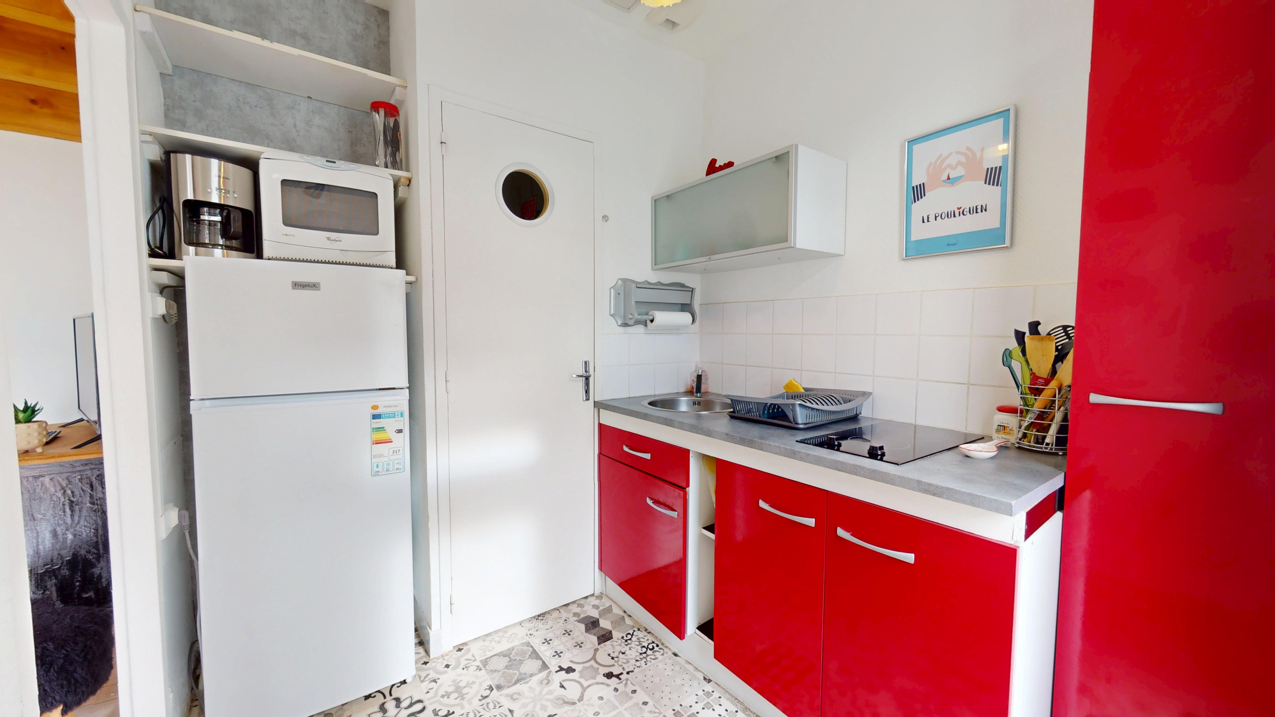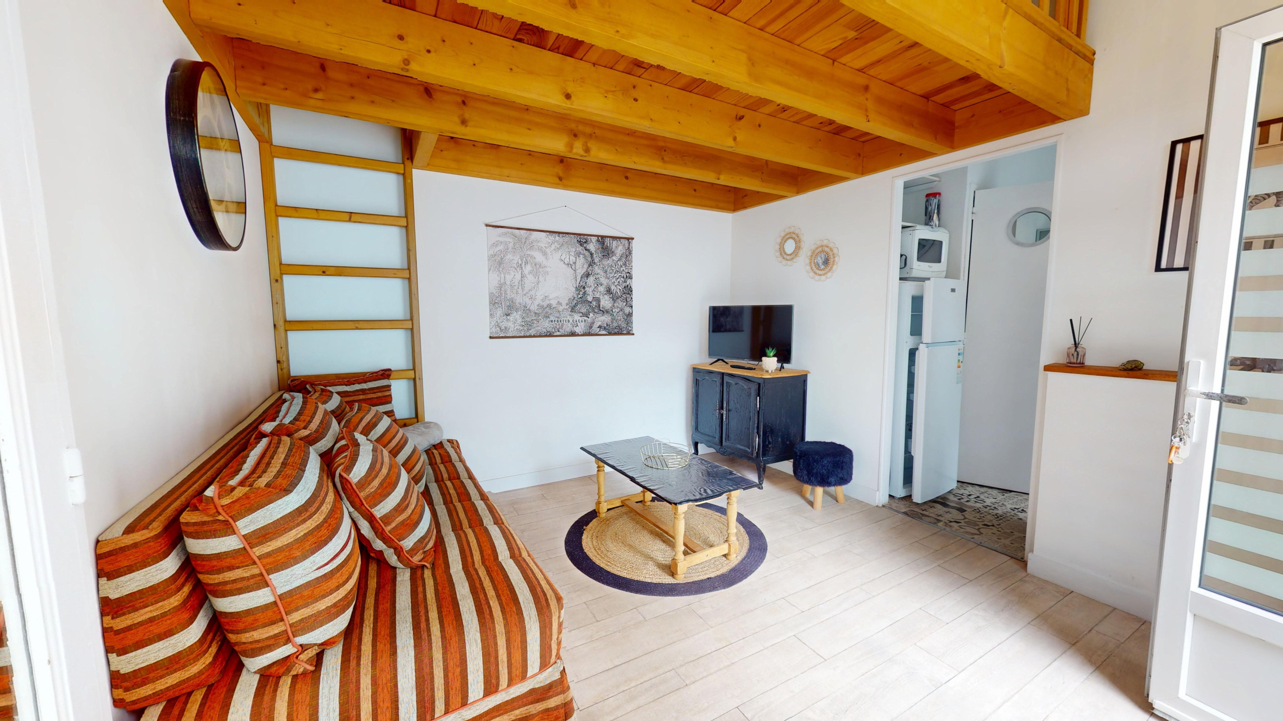 À l’intérieur, l’espace a été pensé pour allier confort et fonctionnalité. Dès l’entrée, vous découvrirez un salon cosy et spacieux baigné de lumière, équipé d’une télévision et d’un canapé-lit double (140x190). Sur votre droite, une jolie cuisine indépendante et moderne vous attend, entièrement équipée (plaques induction et tout le nécessaire) pour préparer vos spécialités locales. Dans le prolongement, vous trouverez une salle de bain fonctionnelle avec douche et WC intégrés.