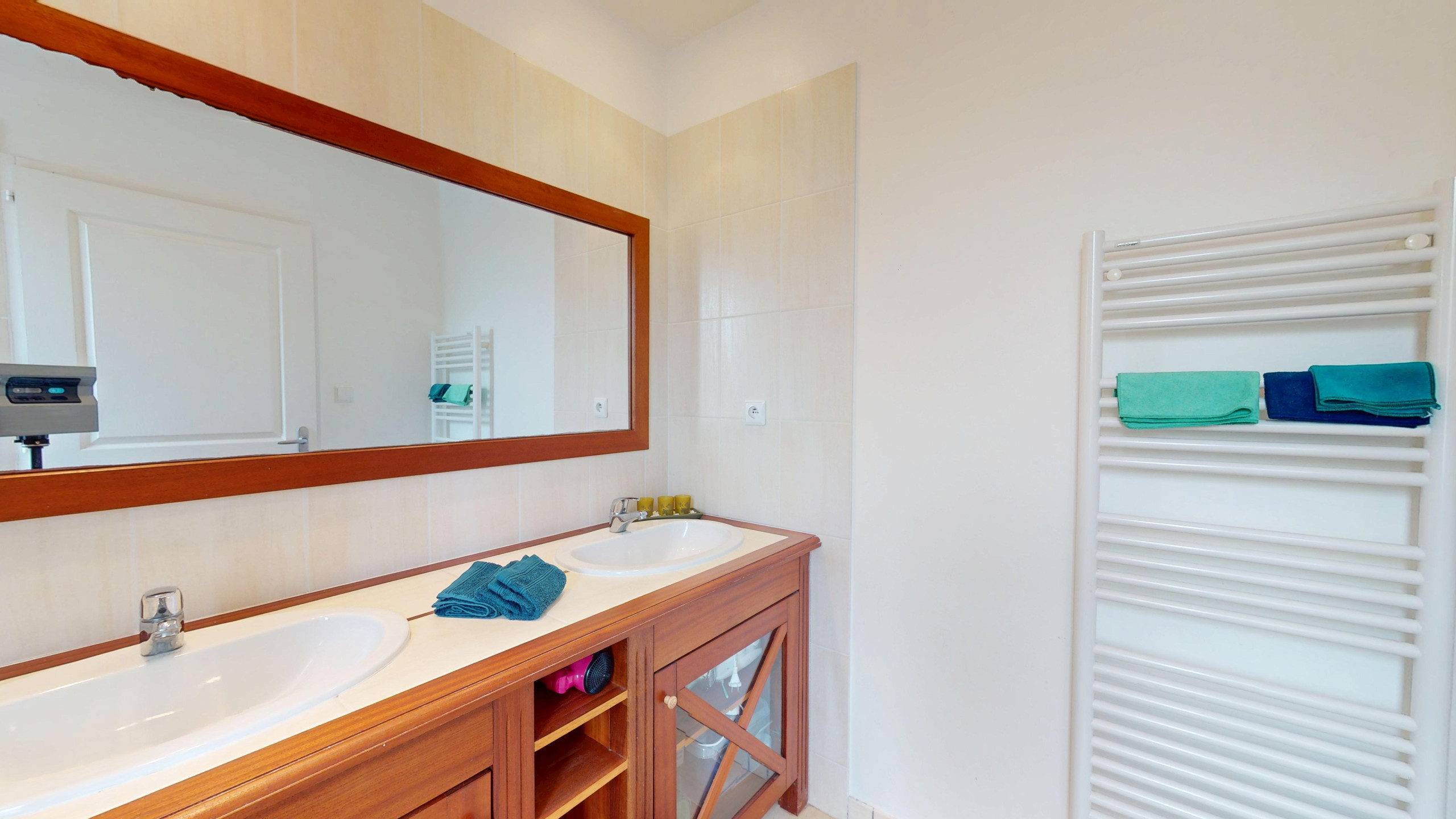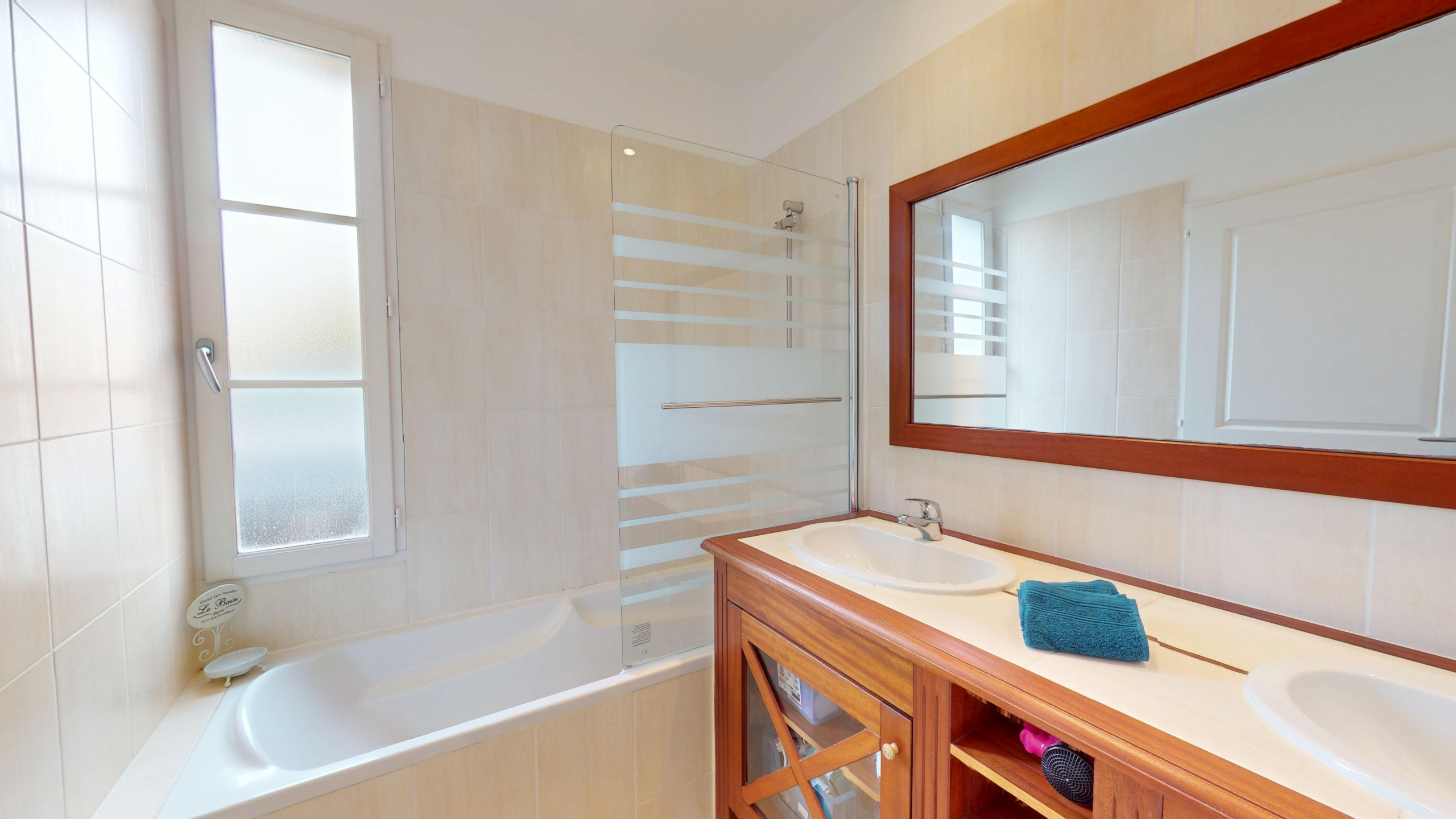 La villa dispose de deux salles de bains : l'une au rez-de-chaussée, équipée d’une baignoire, de deux vasques et de rangements pratiques, et l'autre à l'étage, avec une douche, un lavabo et des toilettes.