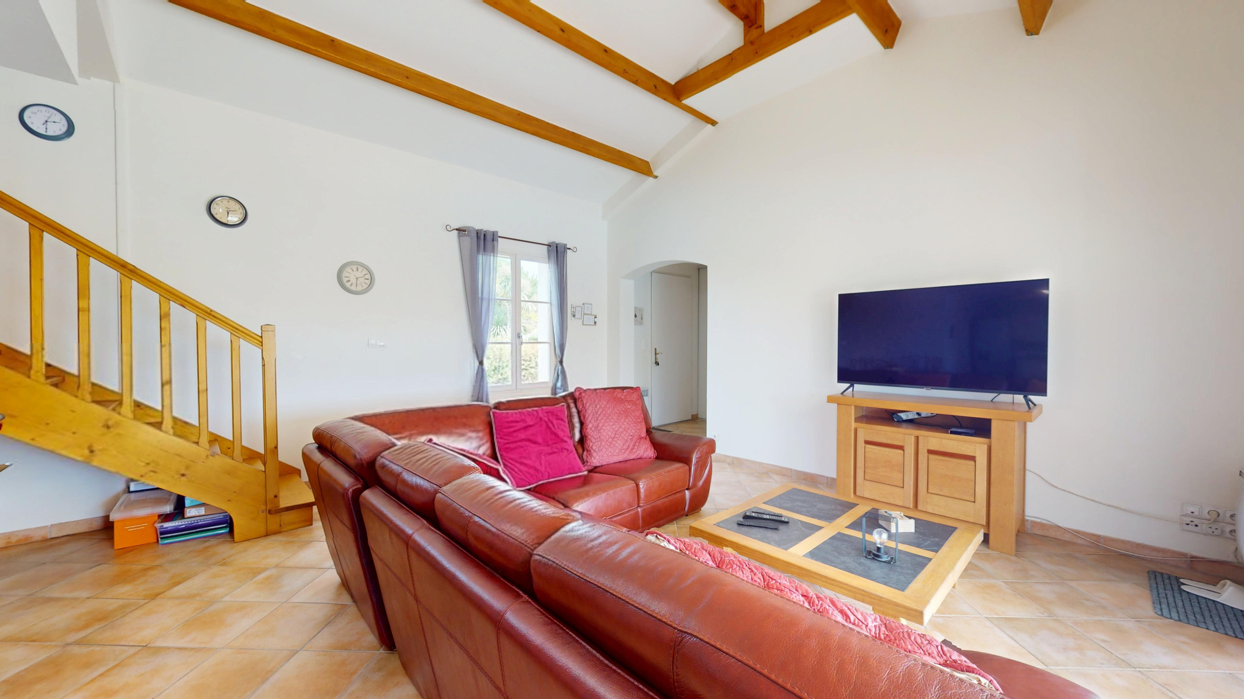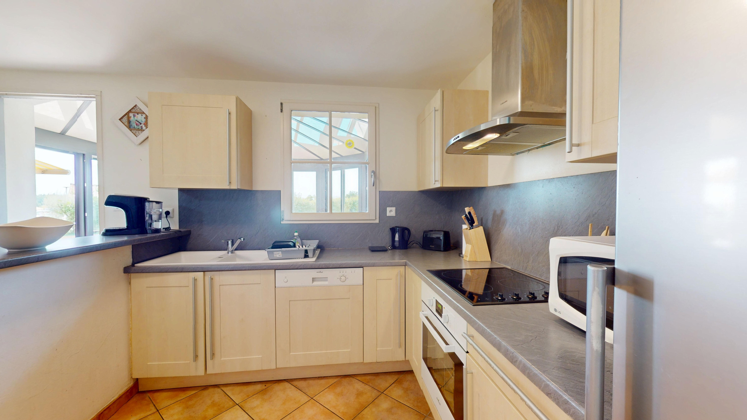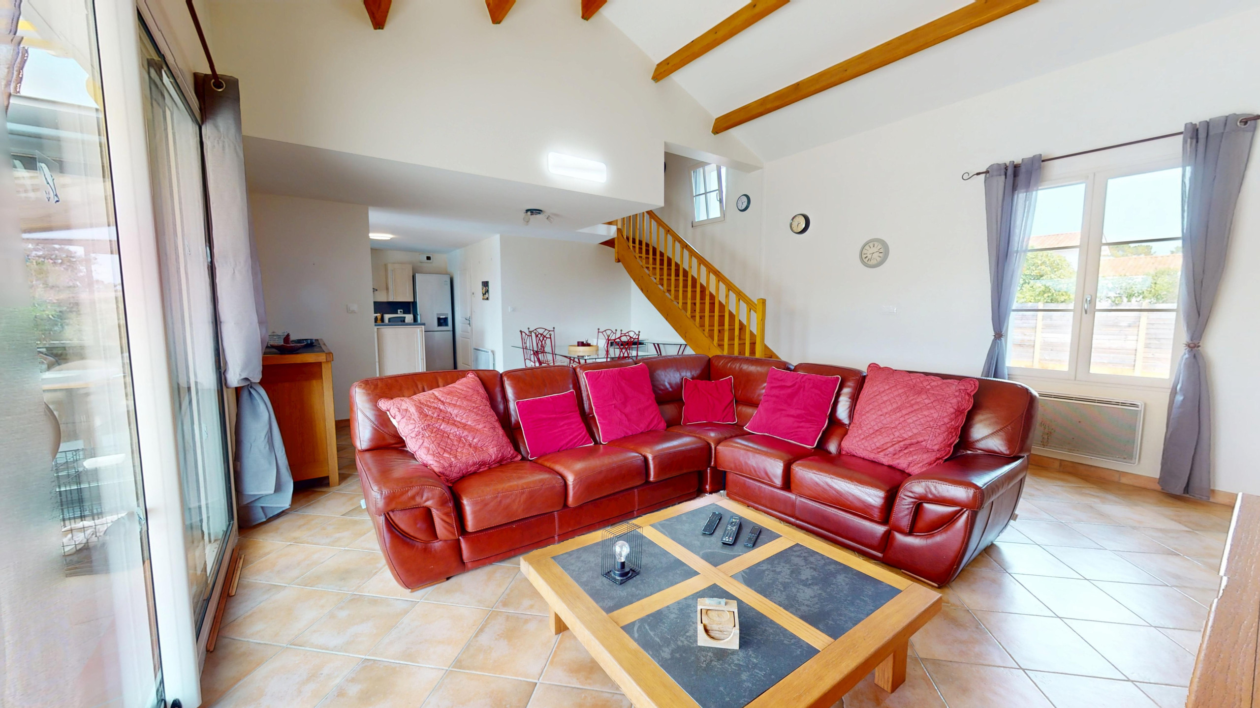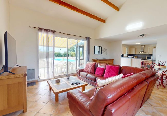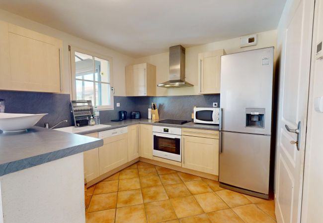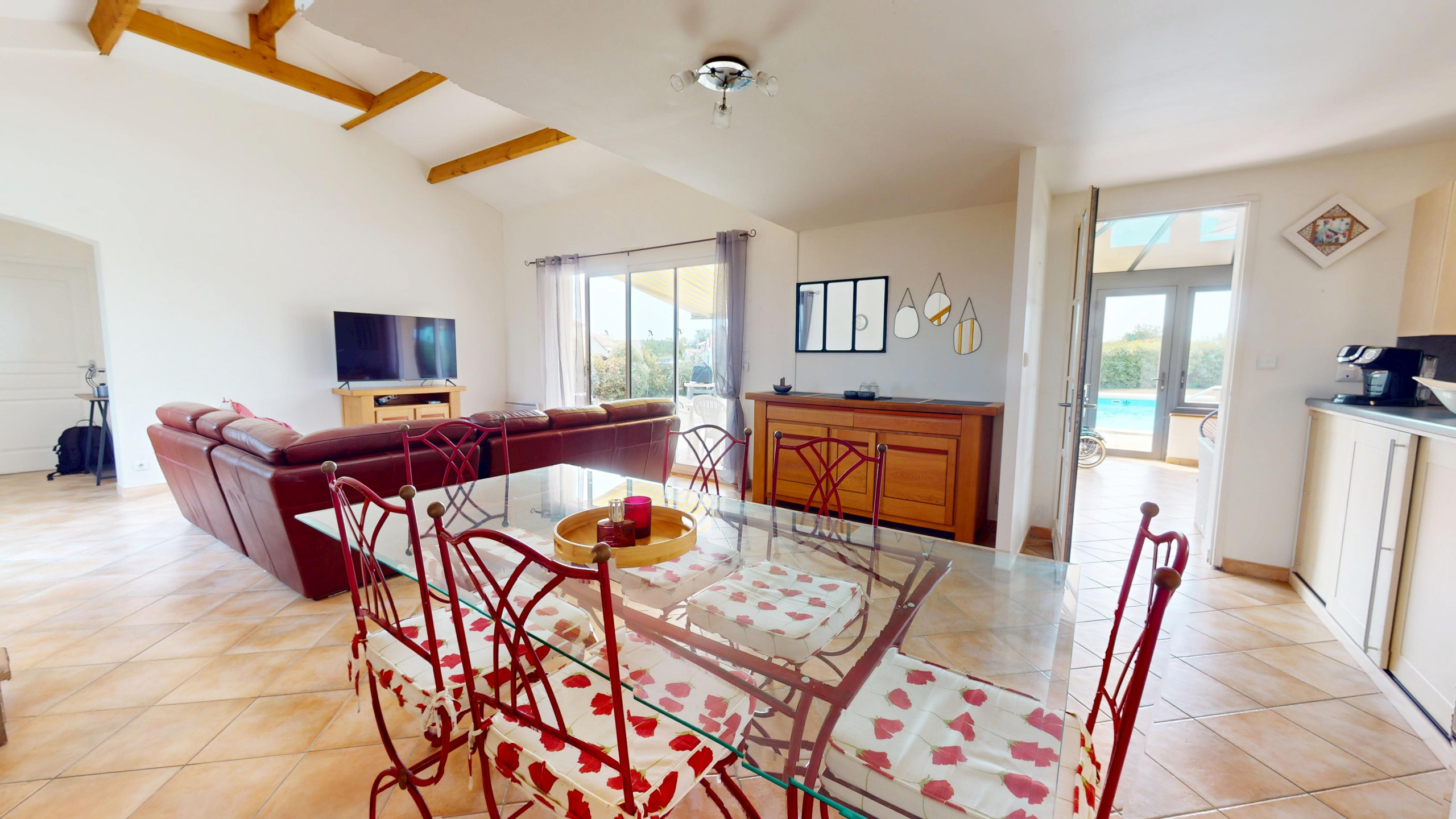 Le salon spacieux et lumineux offre une vue imprenable sur la piscine et le jardin. C’est l’endroit parfait pour se détendre après une journée de visites ou de détente autour de la piscine. Vous y trouverez également une télévision pour des moments conviviaux en soirée. La cuisine ouverte est entièrement équipée, avec tout le nécessaire pour préparer vos repas. Vous pourrez ainsi profiter de repas faits maison dans une ambiance moderne et fonctionnelle.