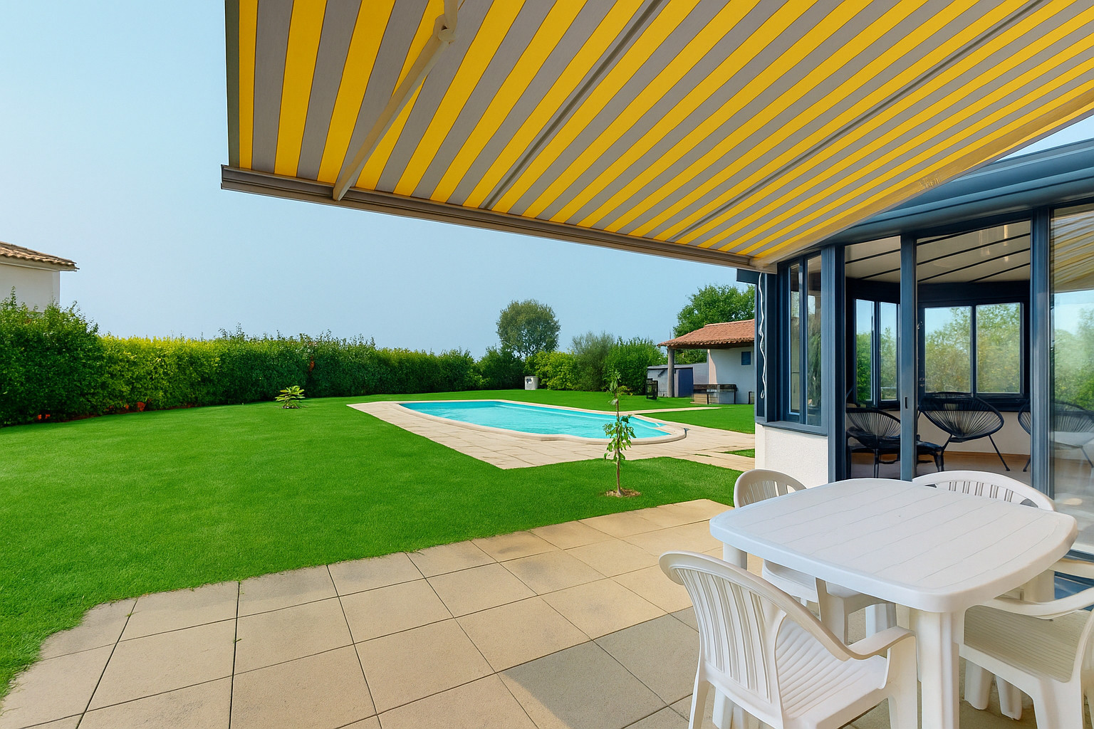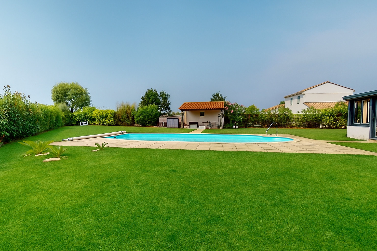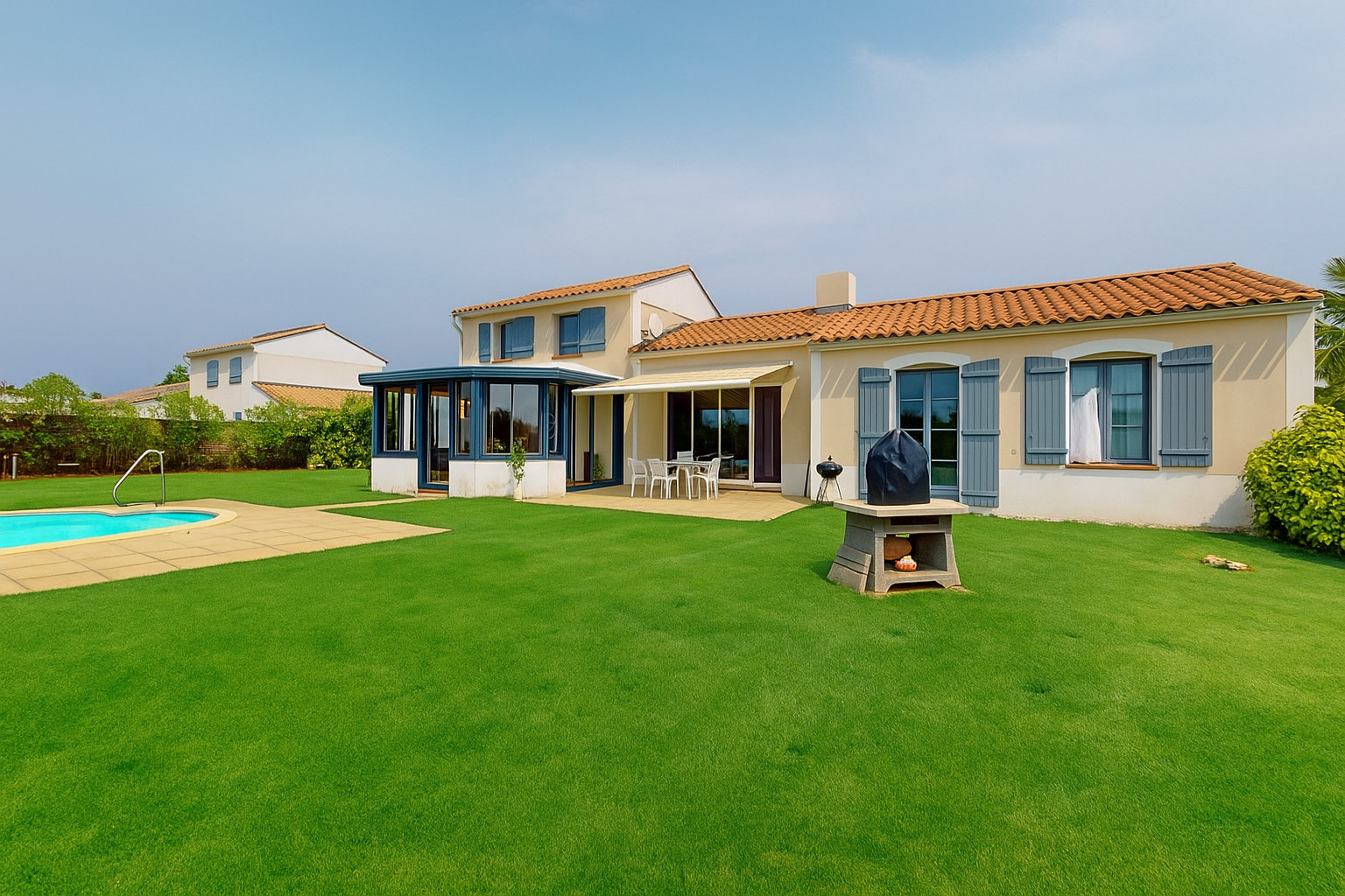 À l’extérieur, le jardin clos vous offre une totale intimité pour profiter de la belle saison. Le salon de jardin avec son barbecue est idéal pour des repas en plein air, tandis que la terrasse avec table et chaises est parfaite pour prendre le soleil ou dîner en extérieur. Si vous préférez un peu plus de calme, la véranda avec son coin salon vous permettra de savourer une vue apaisante sur la piscine.