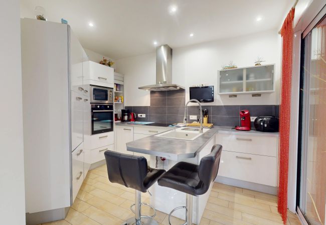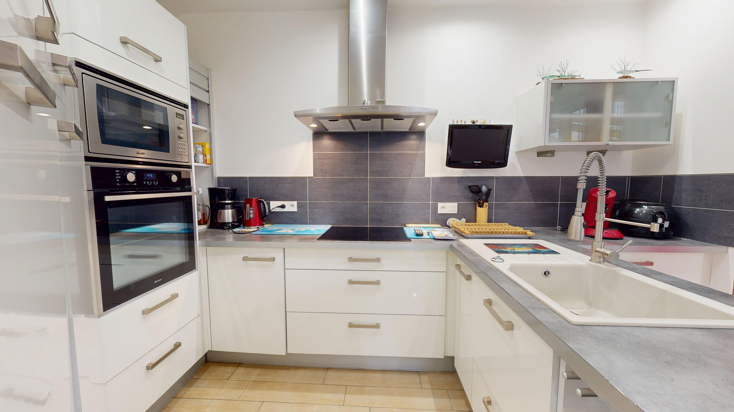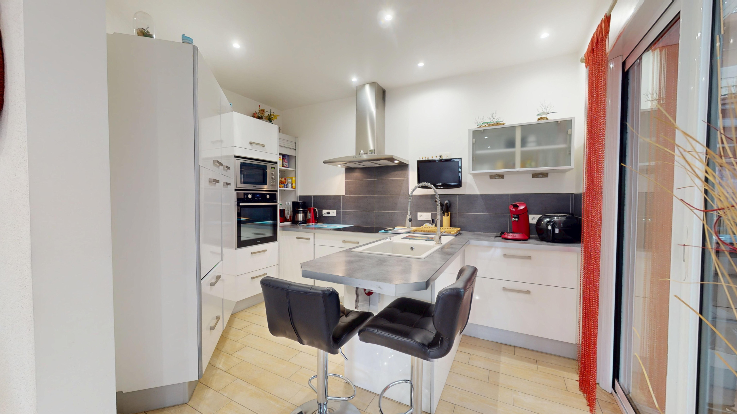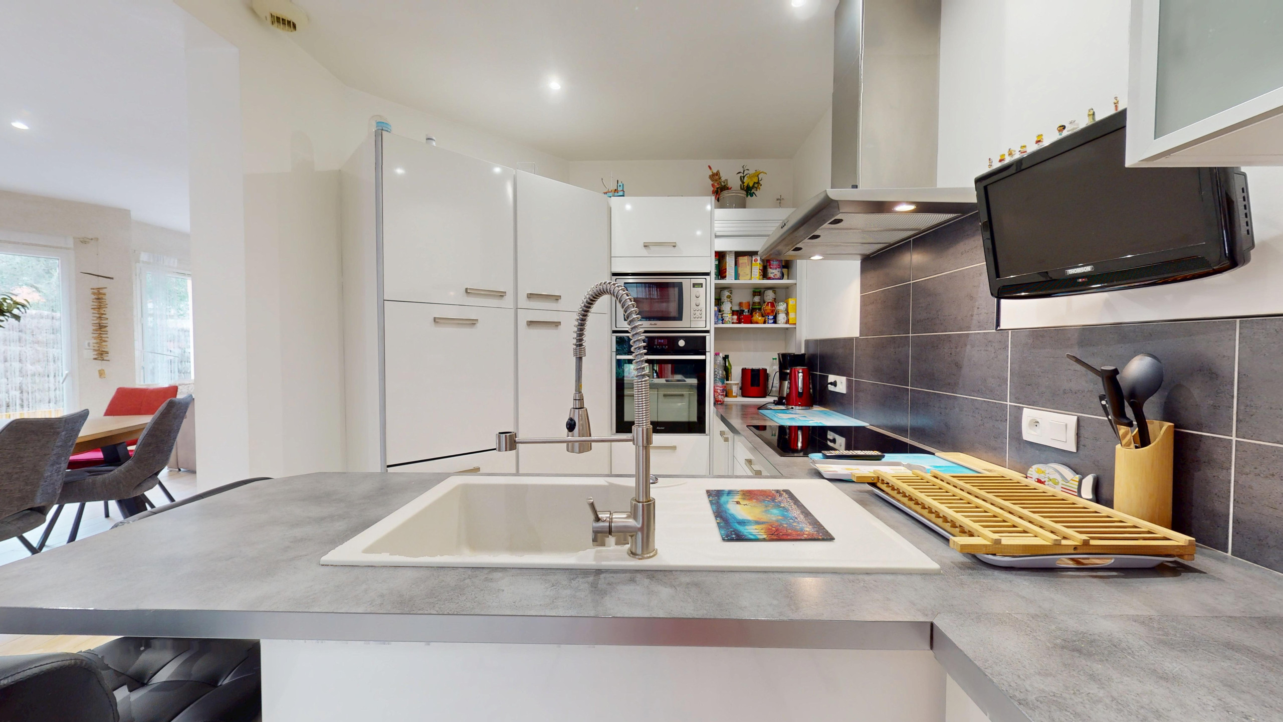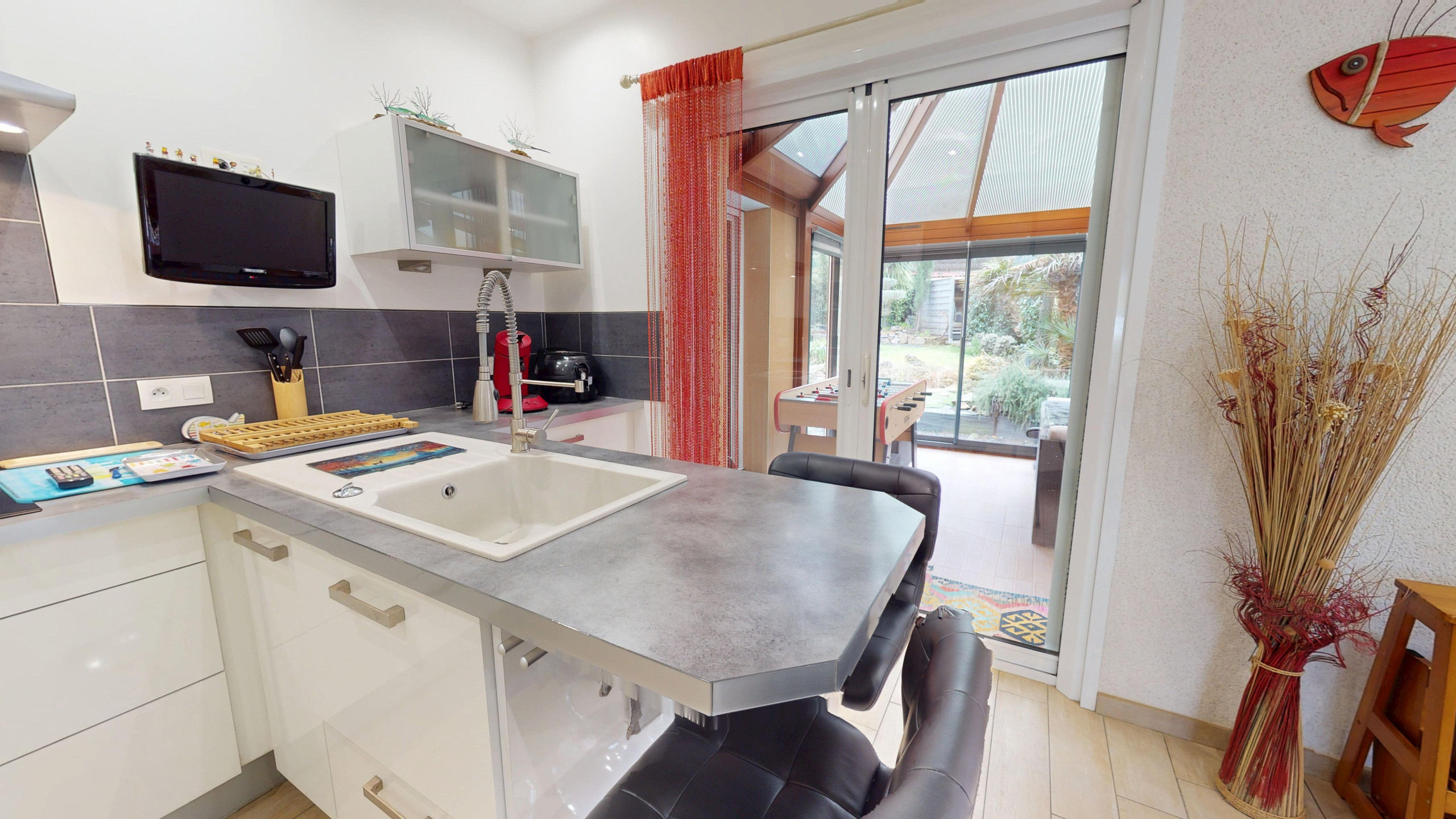 La cuisine aménagée et entièrement équipée (réfrigérateur, congélateur, plaques à induction, hotte et équipements nécessaires au quotidien) dispose également de sa télévision, offrant un vrai confort lors des repas en famille ou entre amis.