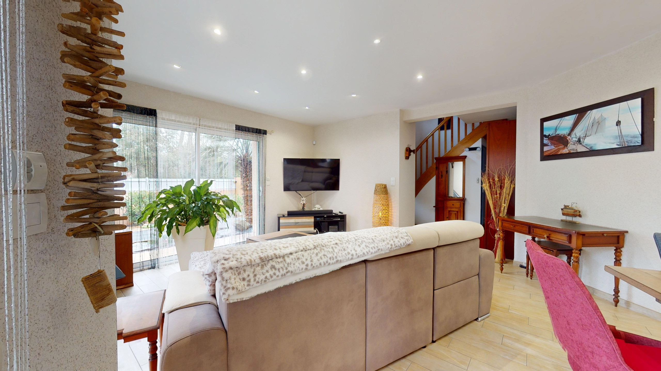 Au rez-de-chaussée, la villa s’ouvre sur une entrée avec penderie, menant à un beau salon-séjour lumineux, équipé d’une télévision, idéal pour se retrouver après une journée à la plage.