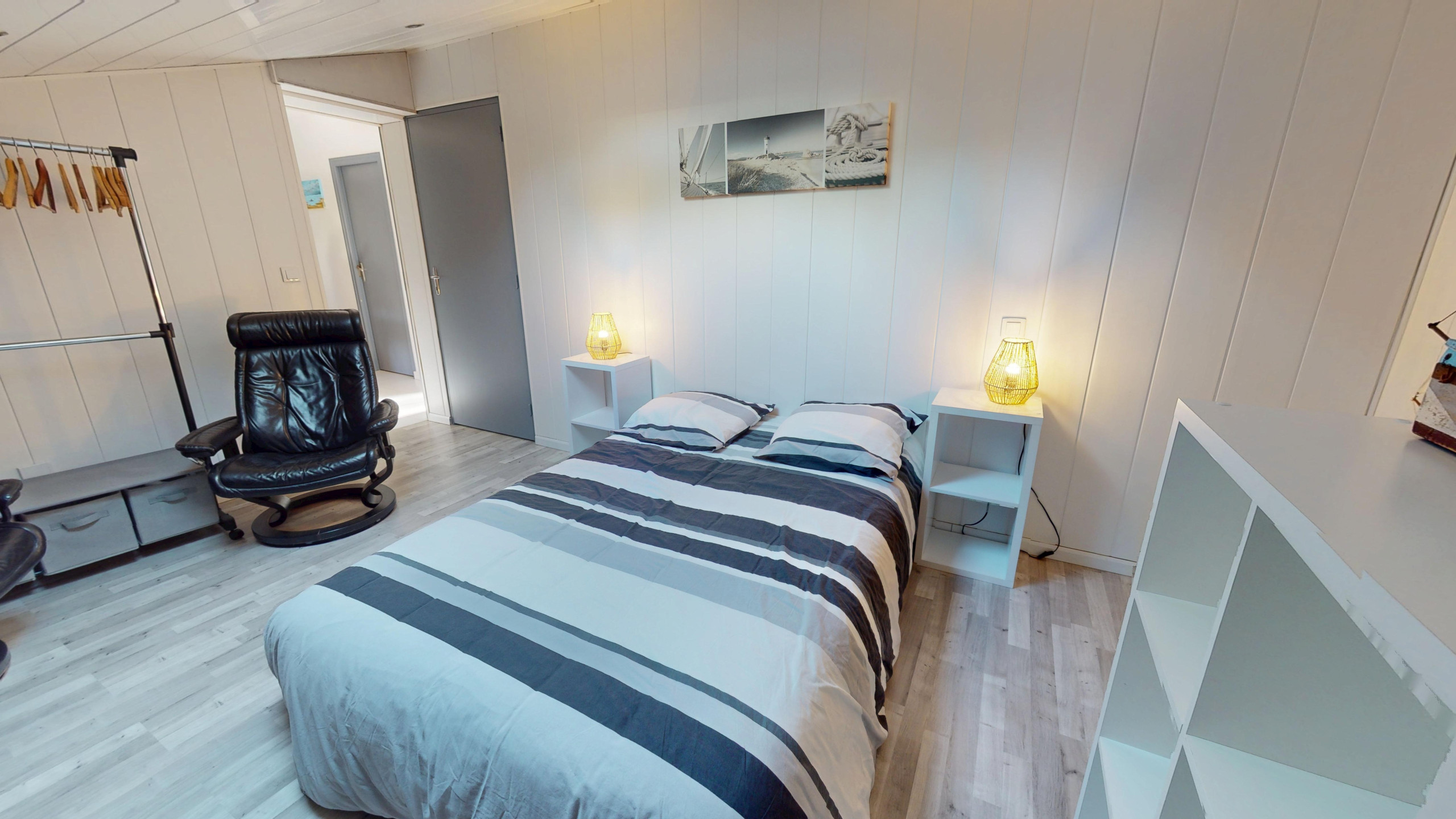 -une chambre avec clic-clac 160 et rangements.