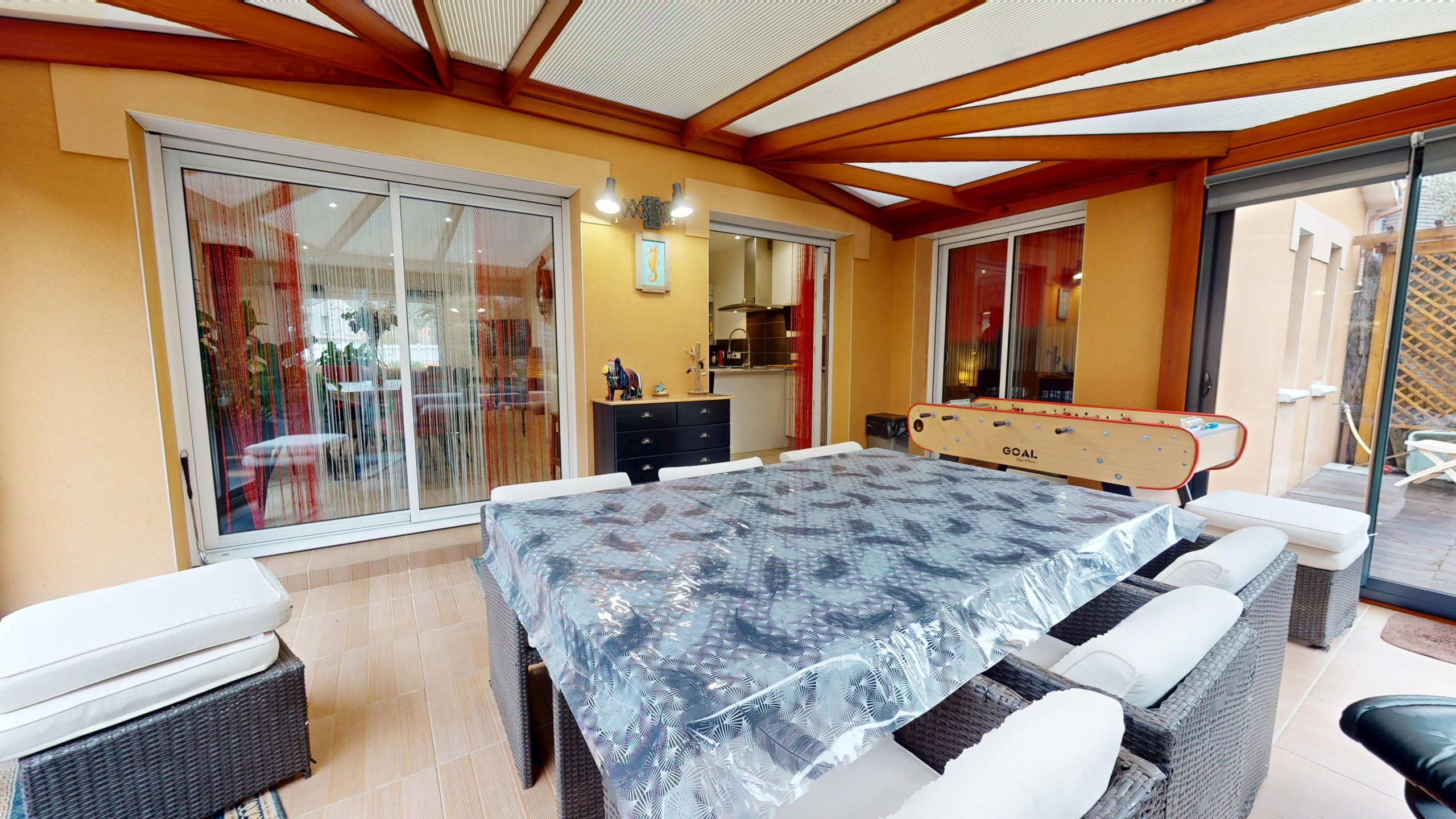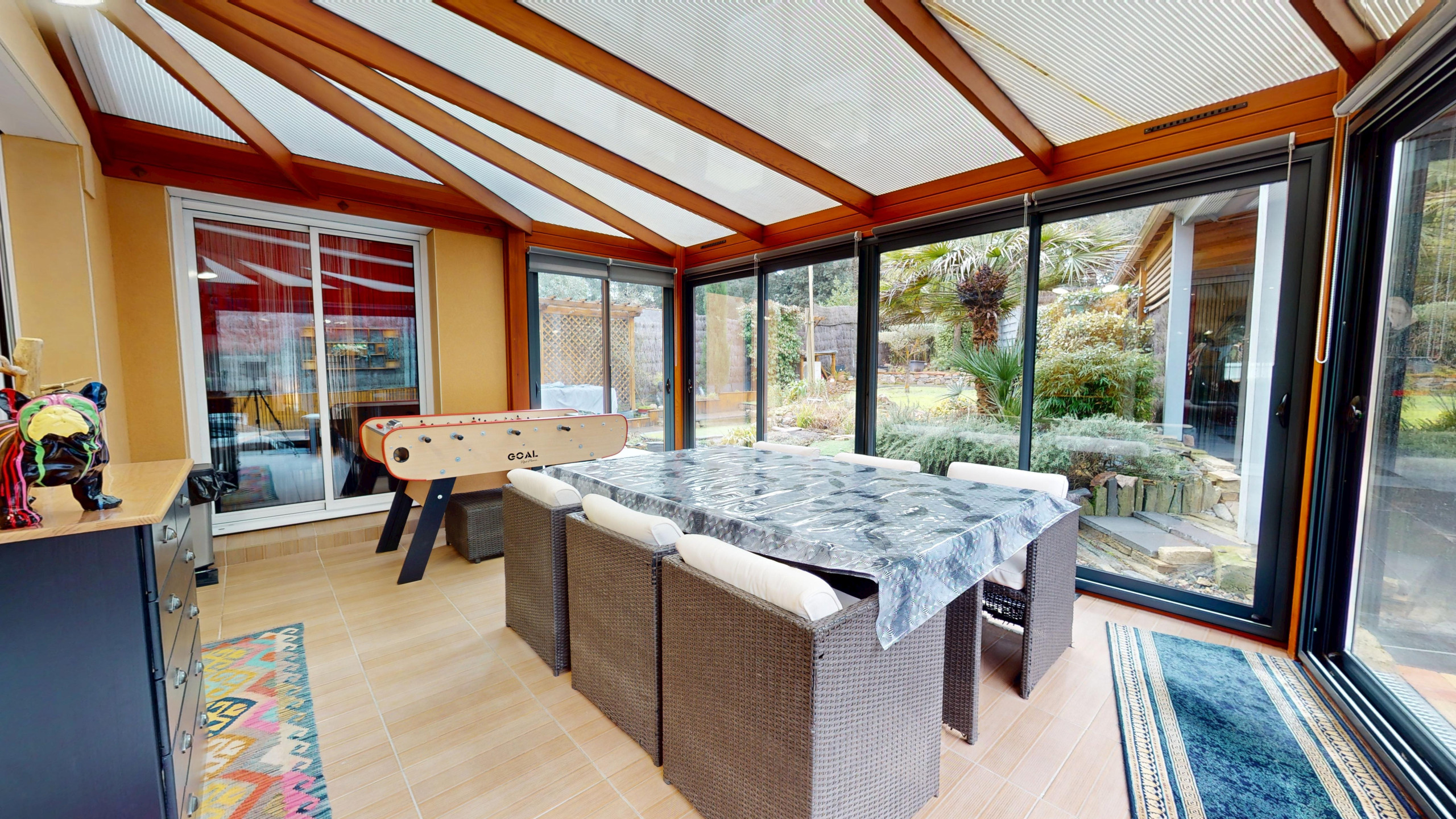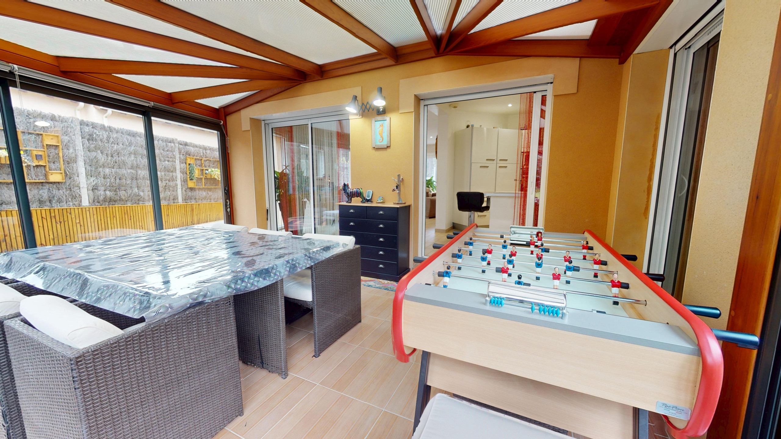Un véritable atout de la maison : une grande véranda, aménagée avec un salon et des jeux, parfaite pour se détendre en toute saison. Vous trouverez également une buanderie avec grand congélateur, lave-linge et sèche-linge, des WC séparés, ainsi qu’une chambre au rez-de-chaussée avec lit 160, penderie, télévision et salle d’eau privative, idéale pour plus de confort et d’intimité.