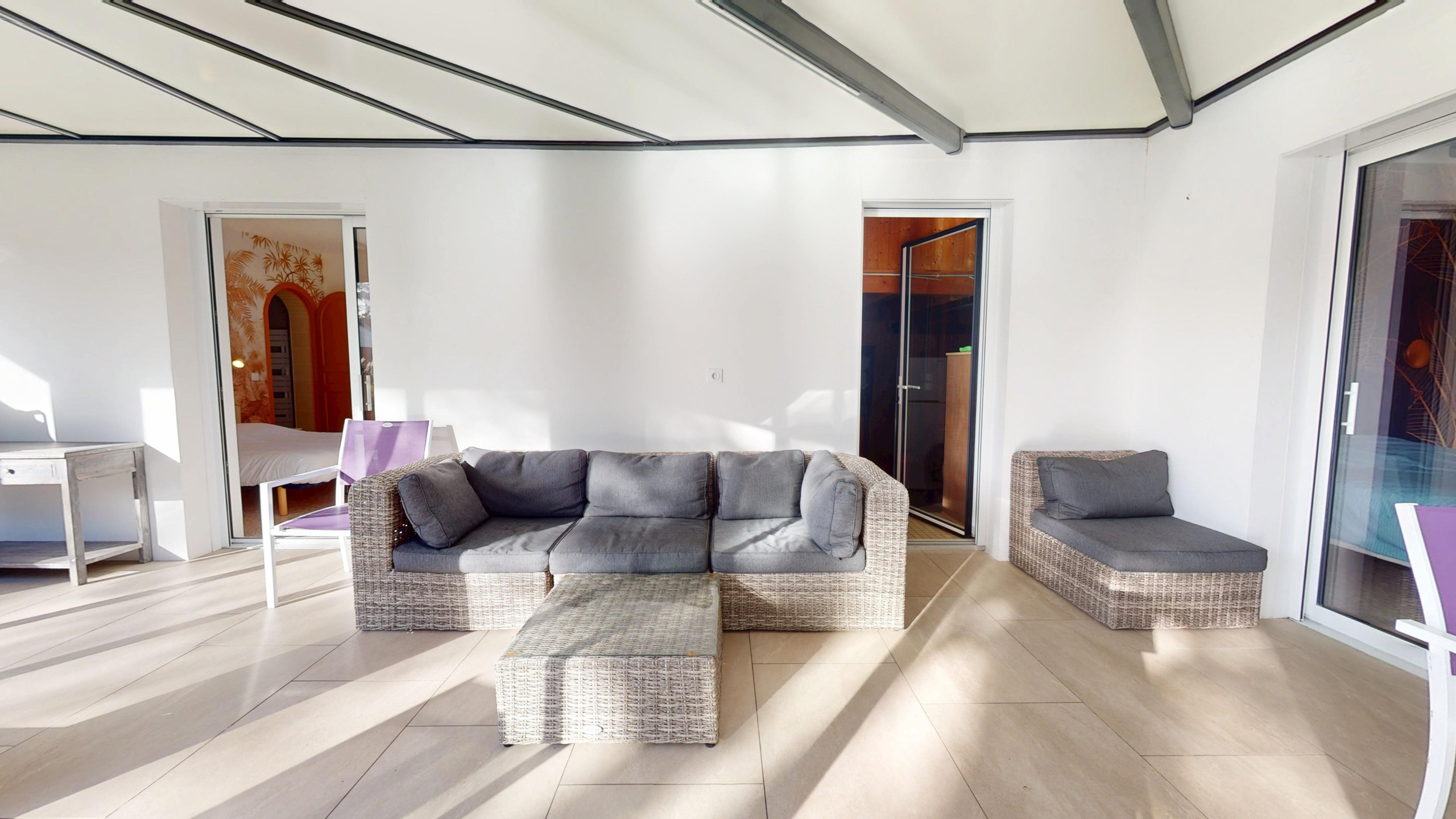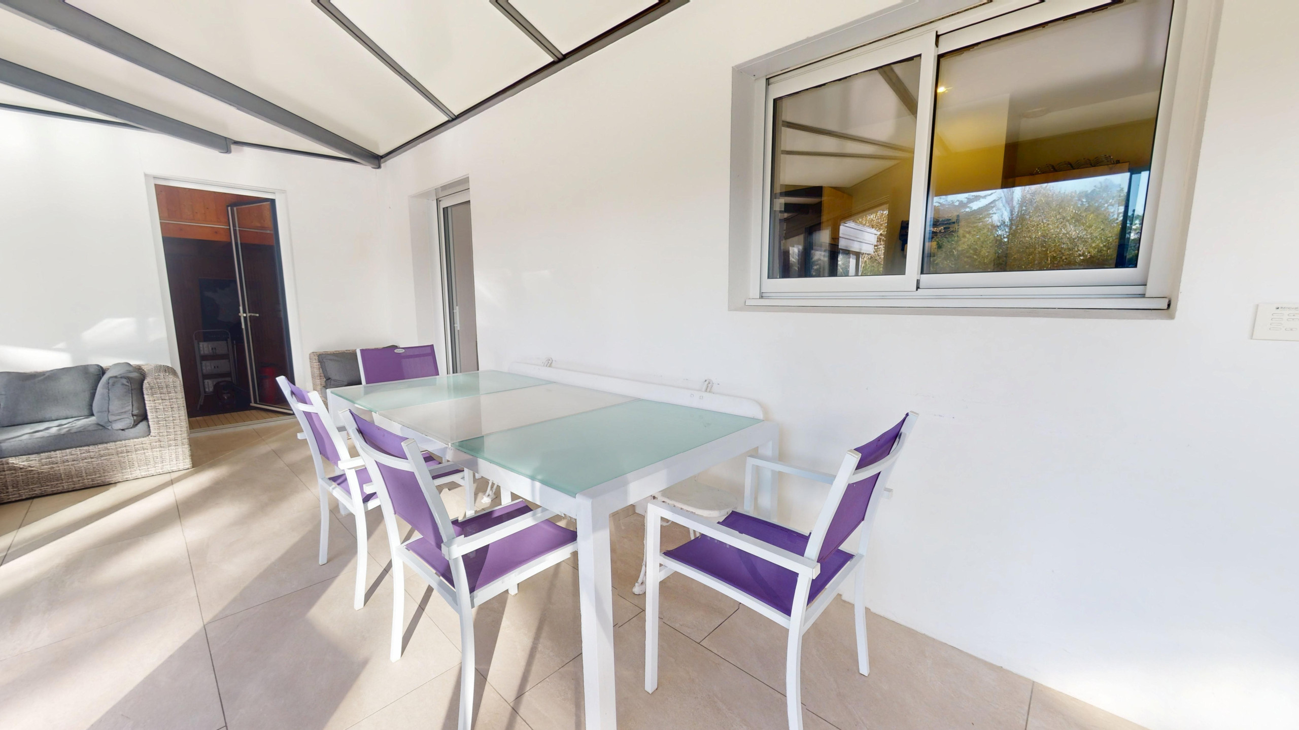 Une spacieuse véranda, également équipée d’une table et de mobilier de jardin, offre un espace supplémentaire très apprécié en toute saison.
